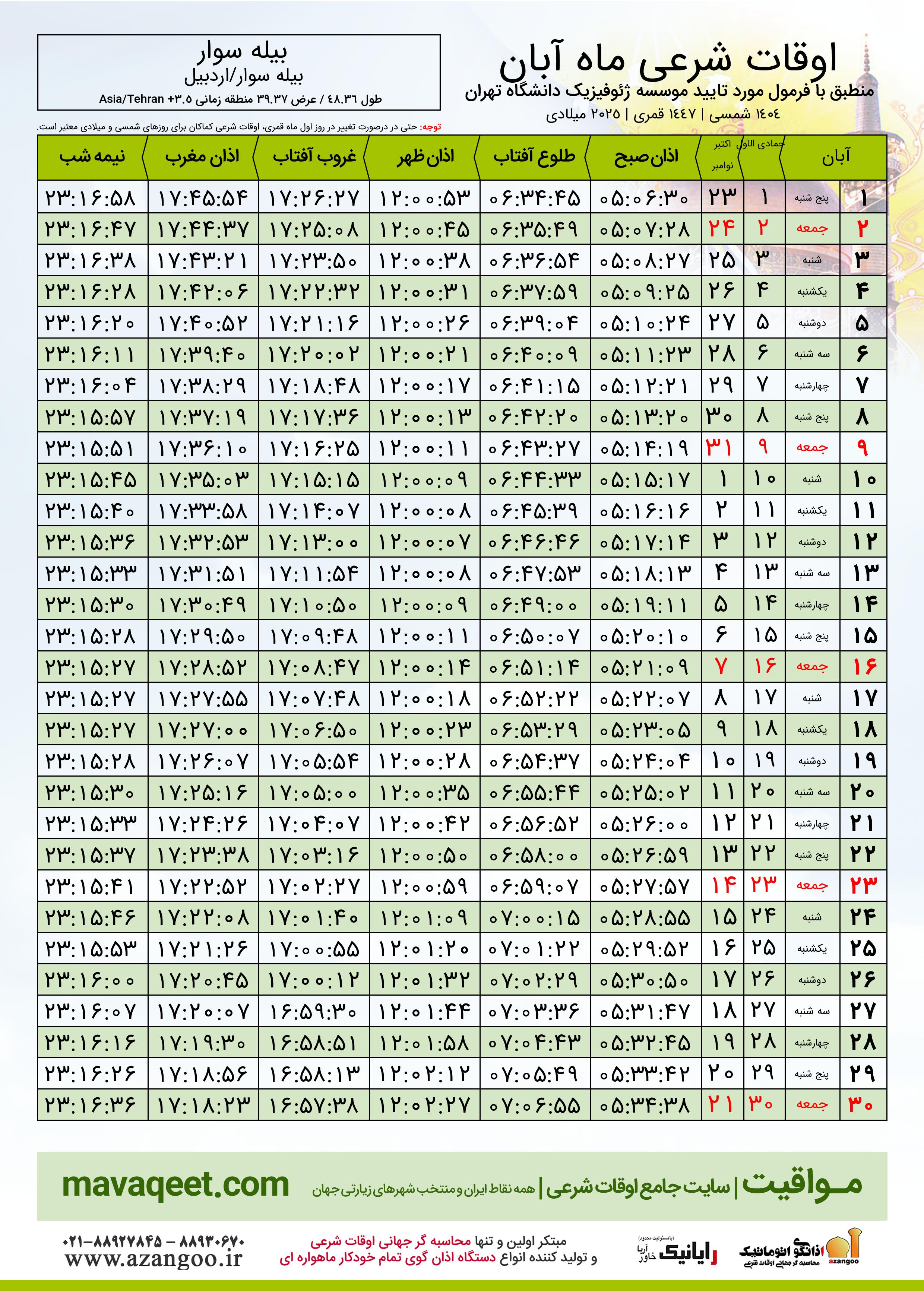 جدول اوقات شرعی آبان ١٤٠٤ شمسی شهر بیله سوار