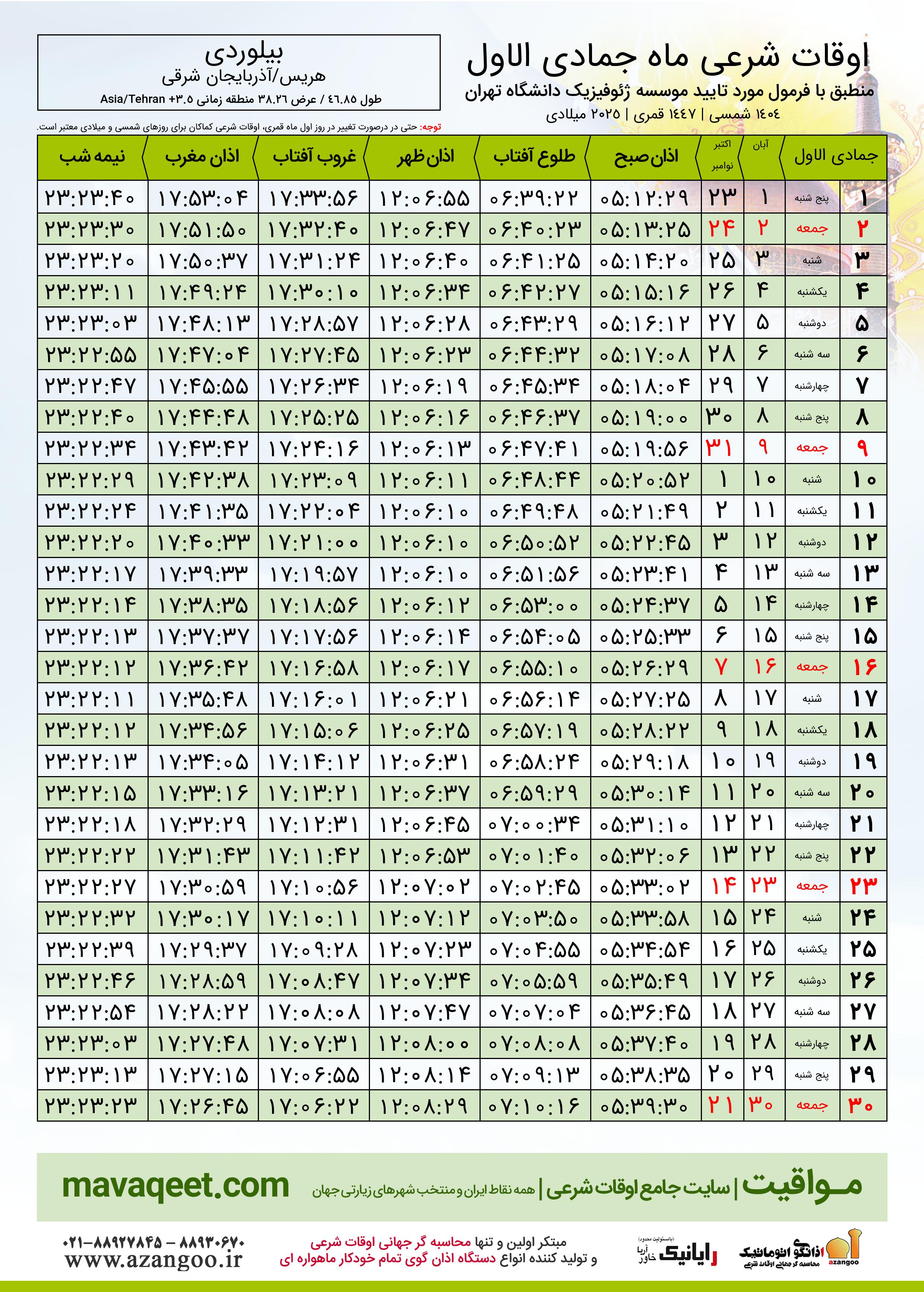 اوقات شرعی ماه جمادی الاول ١٤٤٧ هـ.ق شهر بیلوردی بر