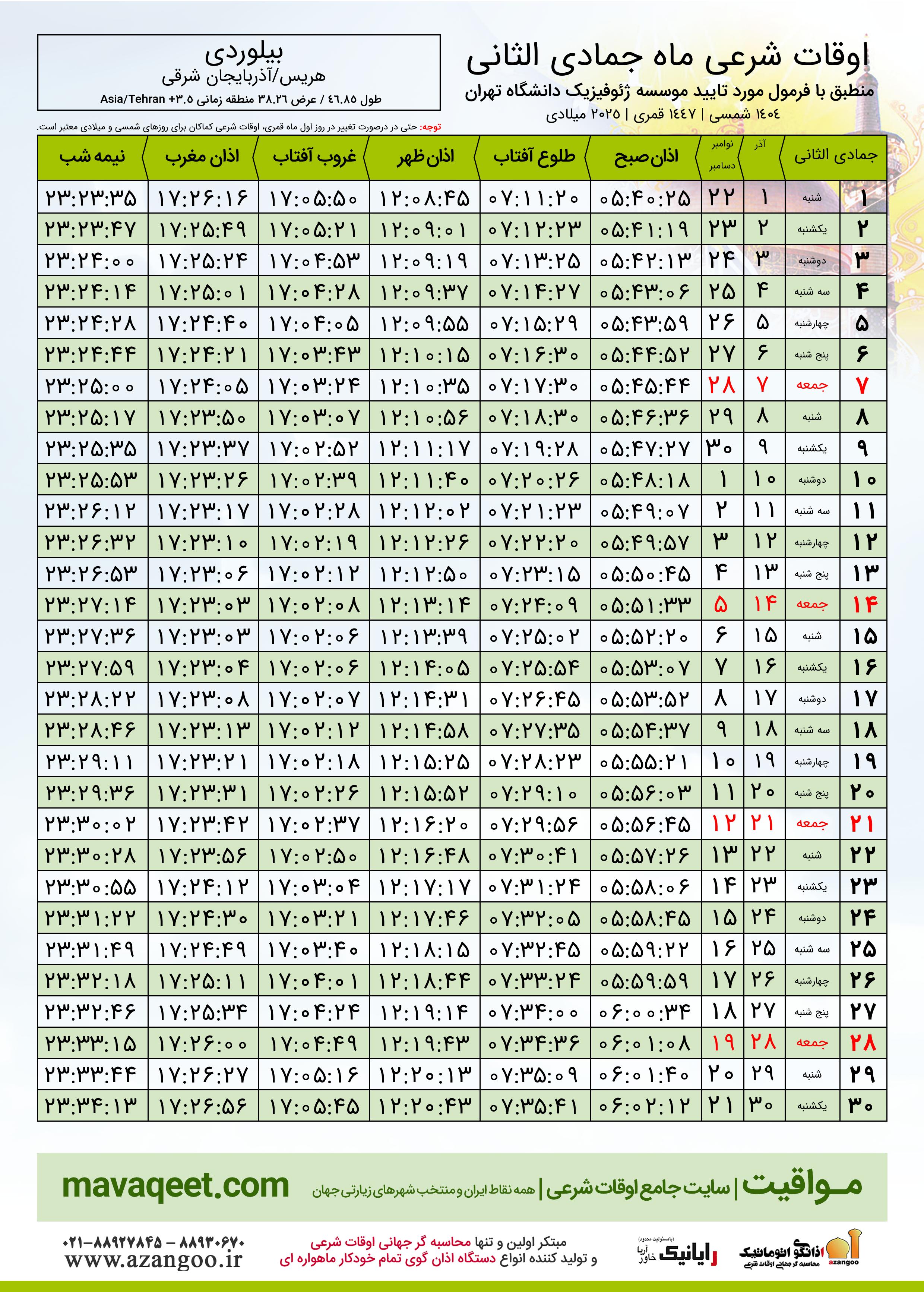 اوقات شرعی ماه جمادی الثانی ١٤٤٧ هـ.ق شهر بیلوردی بر