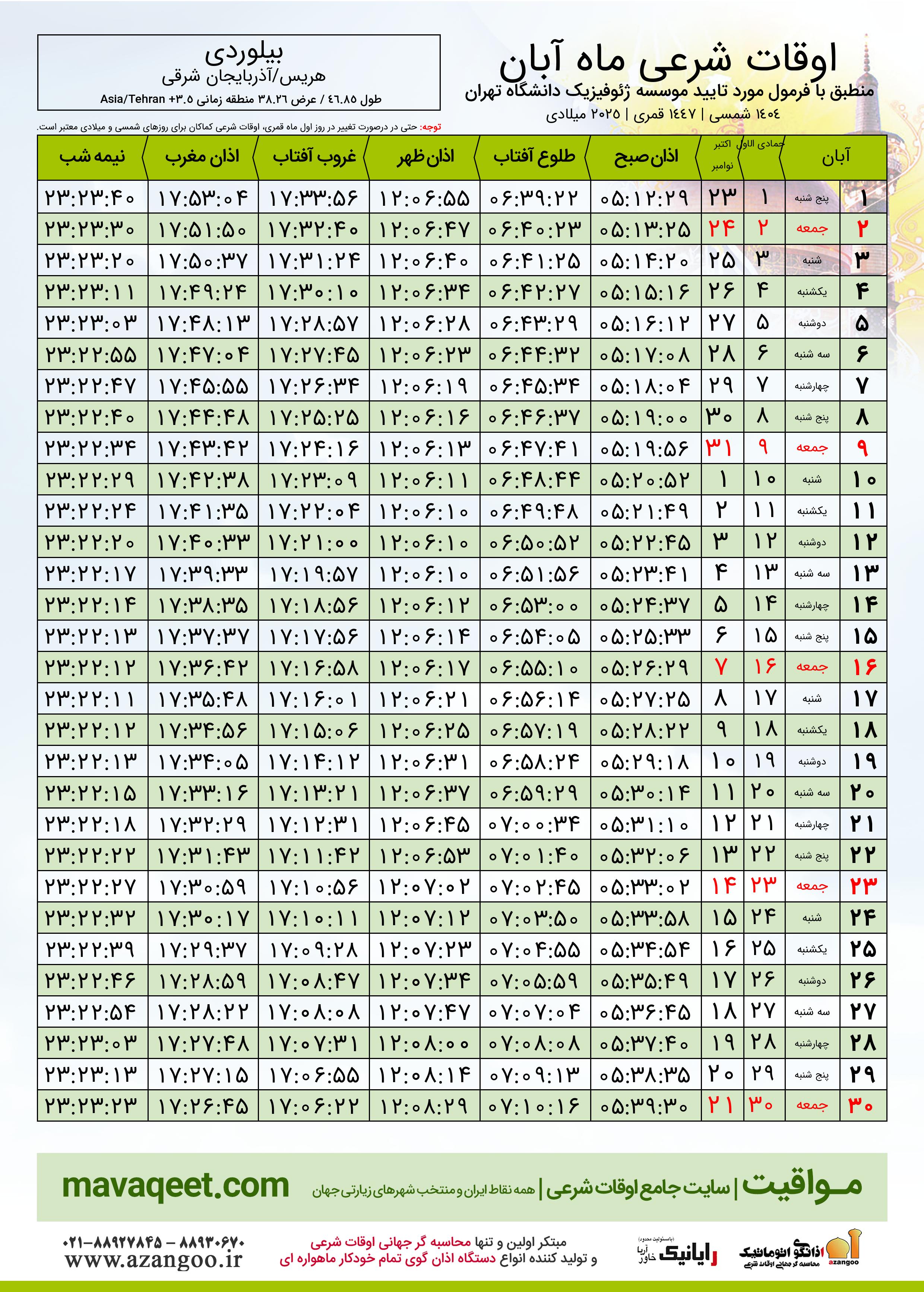جدول اوقات شرعی آبان ١٤٠٤ شمسی شهر بیلوردی