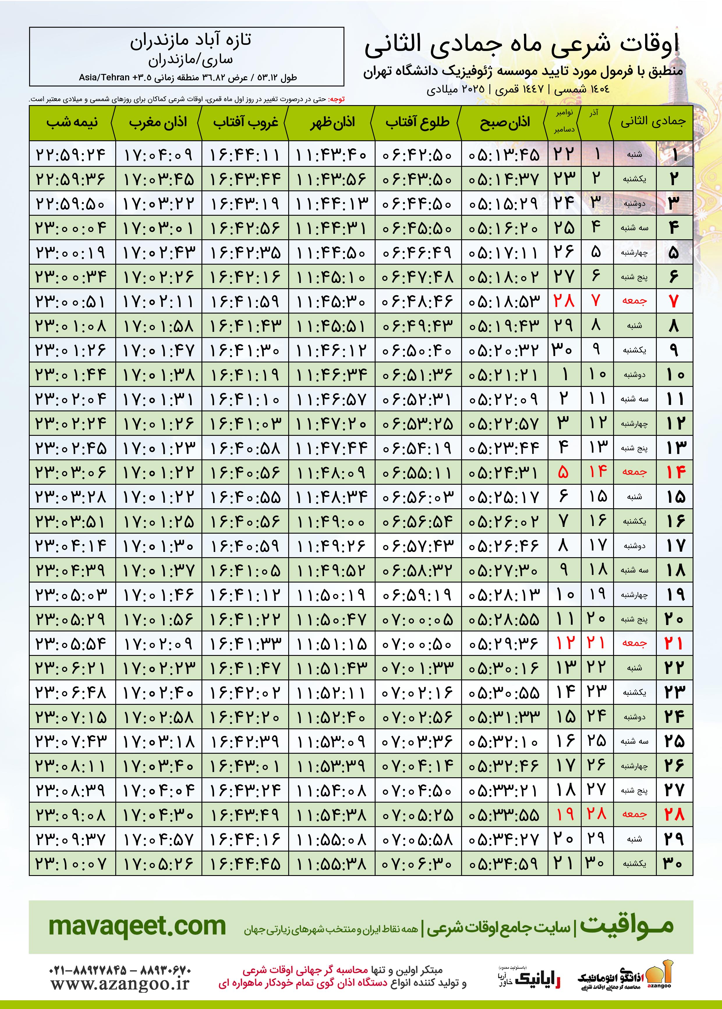 اوقات شرعی ماه جمادی الثانی ١٤٤٧ هـ.ق شهر تازه آباد مازندران بر