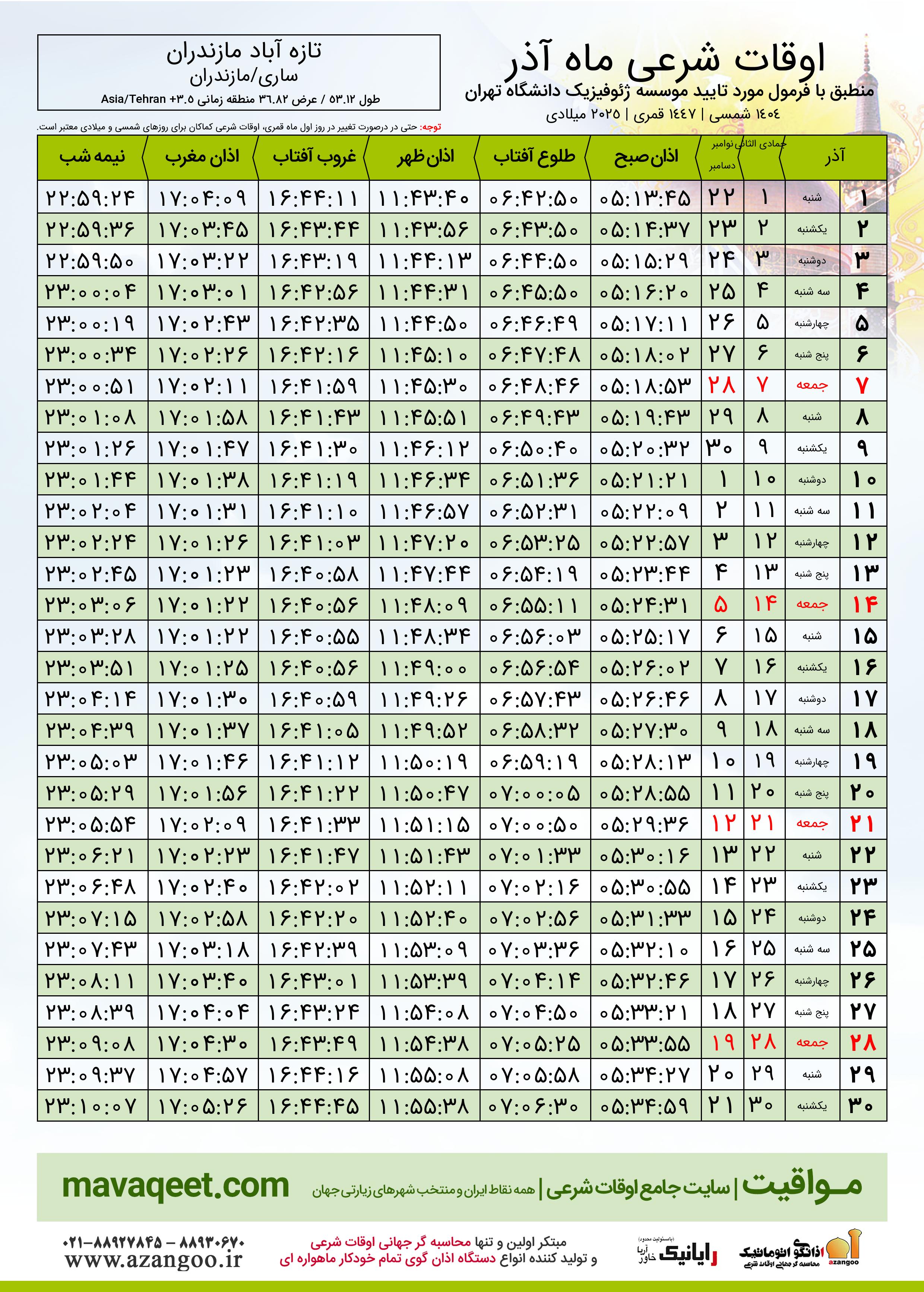اوقات شرعی آذر ١٤٠٤ شمسی شهر تازه آباد مازندران