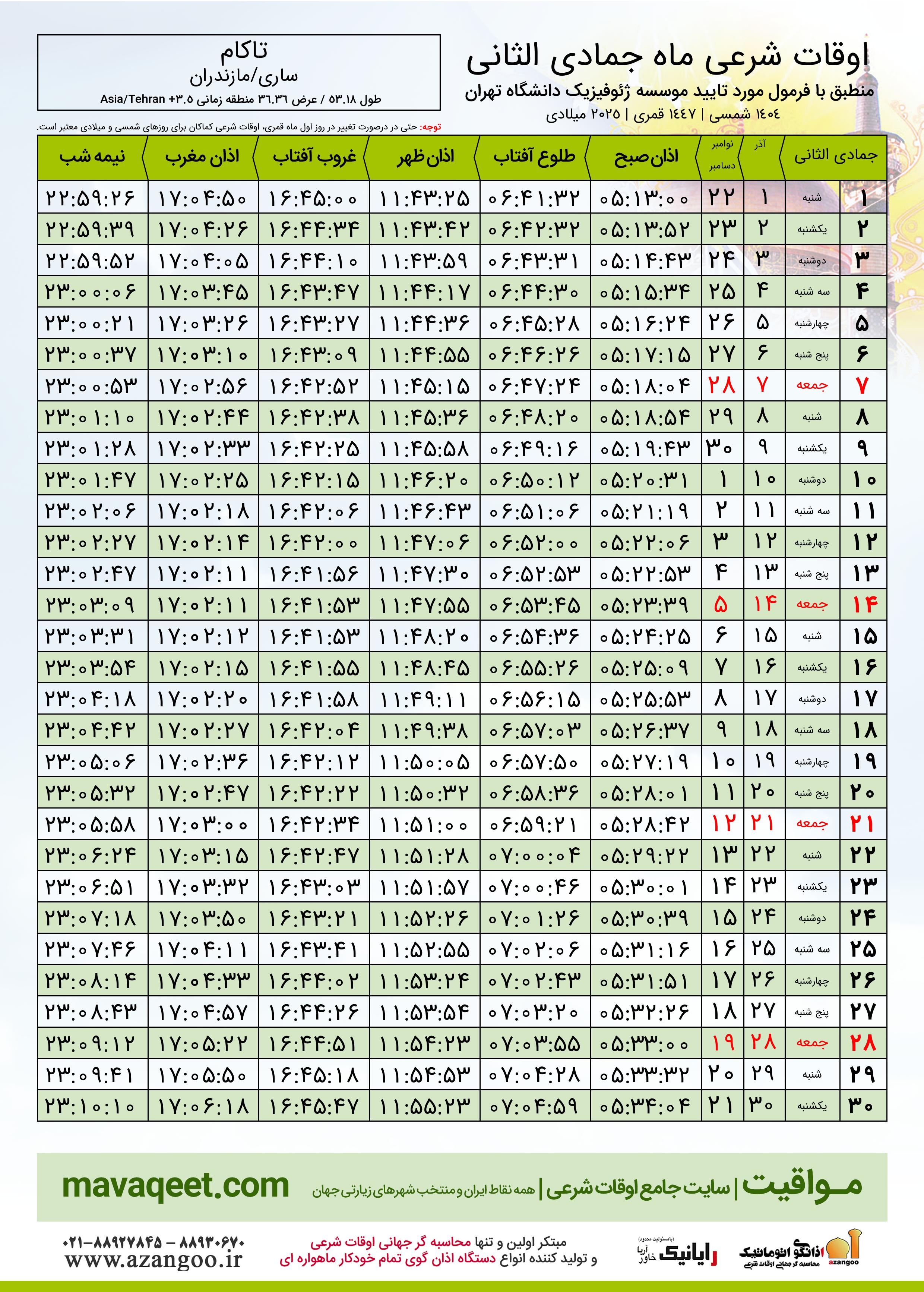 جدول اوقات شرعی جمادی الثانی ١٤٤٧ قمری شهر تاکام