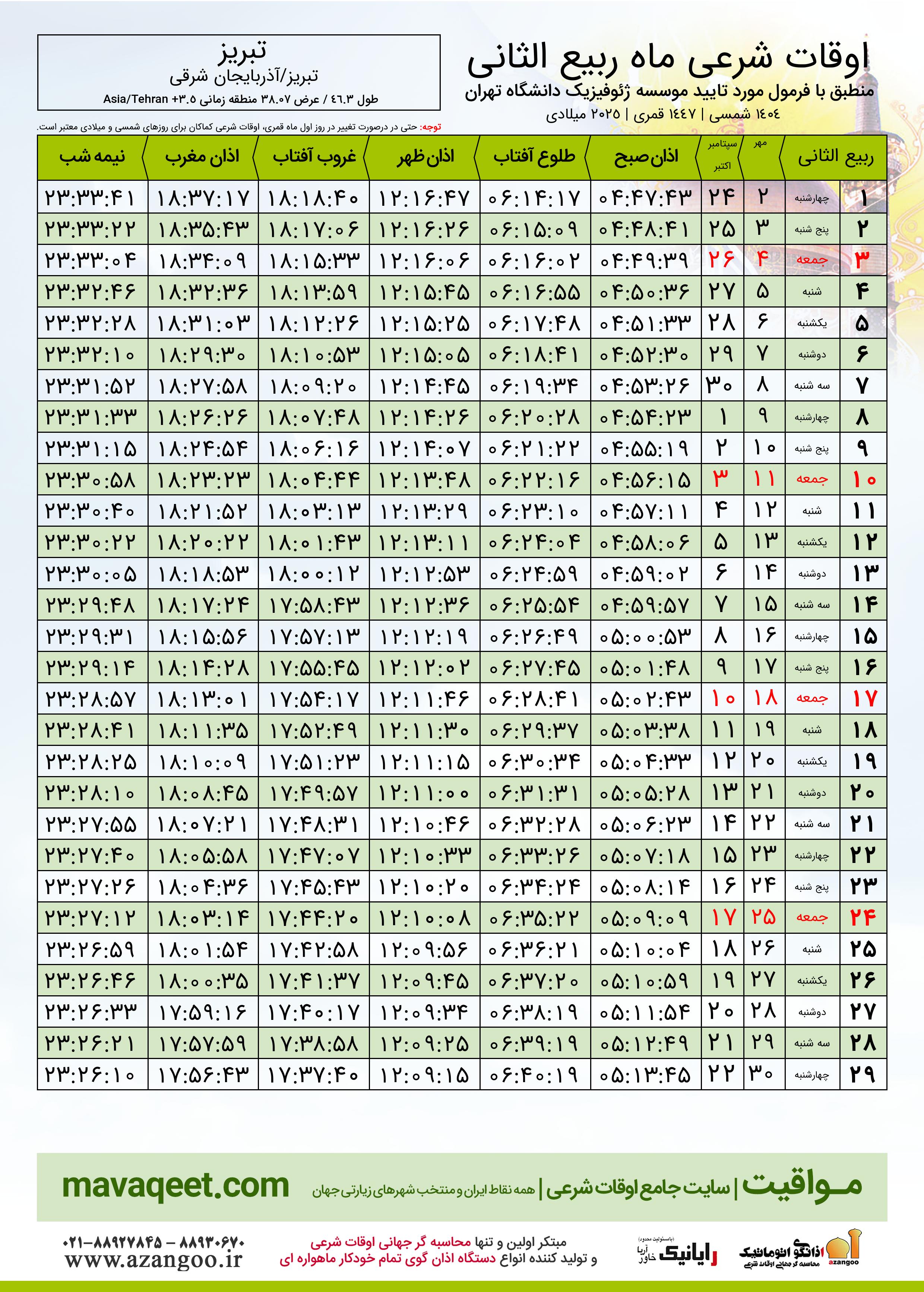 جهت نمایش تصویر جدول اوقات شرعی ماه ربیع الثانی ١٤٤٧ هـ.ق شهر تبریز در اندازه