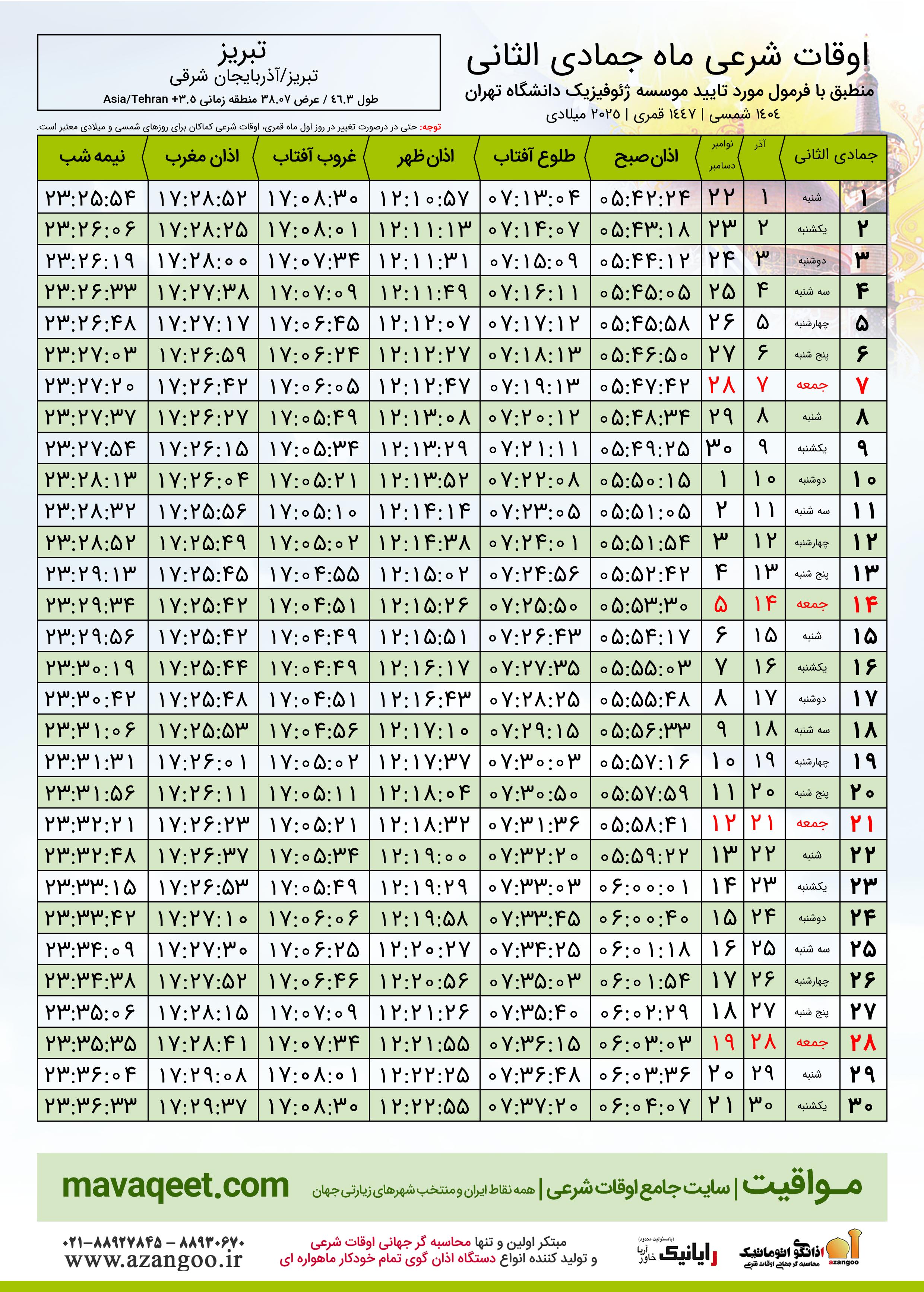 اوقات شرعی ماه جمادی الثانی ١٤٤٧ هـ.ق شهر تبریز بر