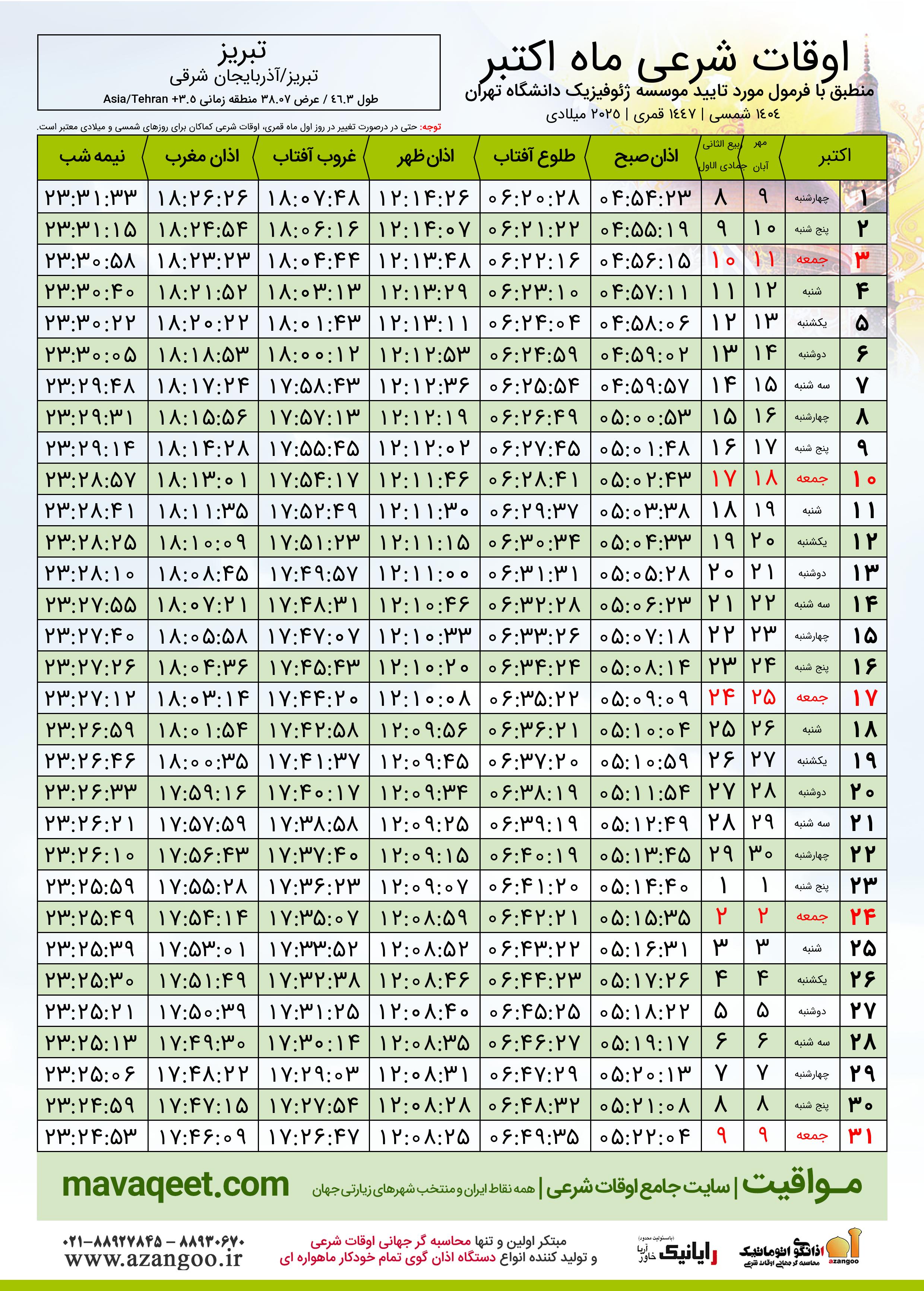 جهت نمایش تصویر جدول اوقات شرعی جدول اوقات شرعی اکتبر ٢٠٢٥ میلادی شهر تبریز شهر تبریز در اندازه