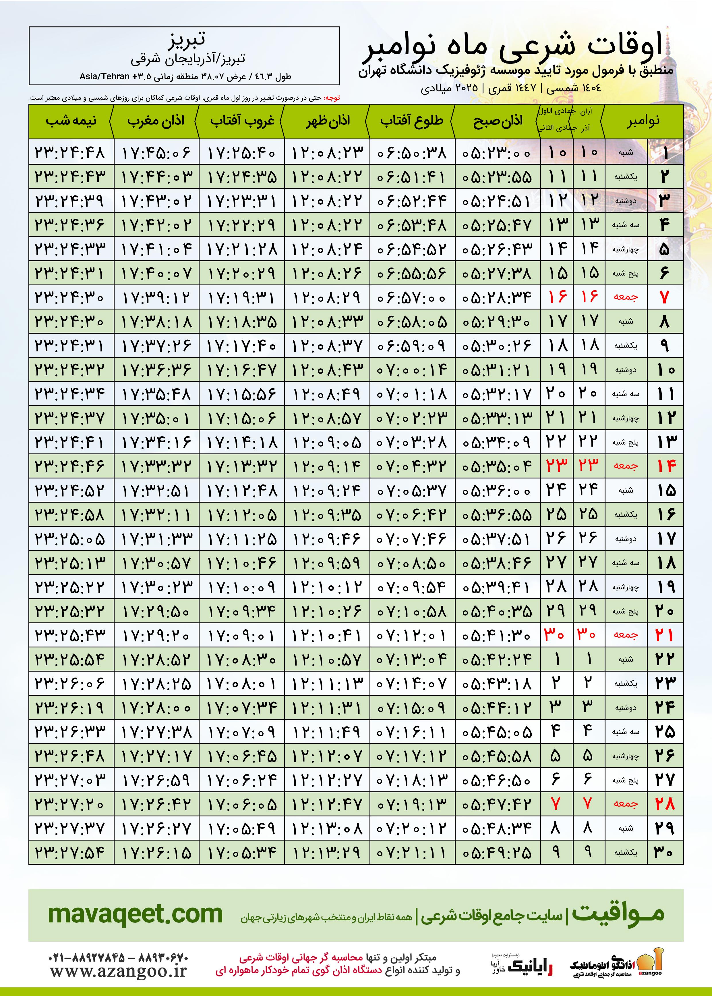 جدول اوقات شرعی نوامبر ٢٠٢٥ میلادی شهر تبریز