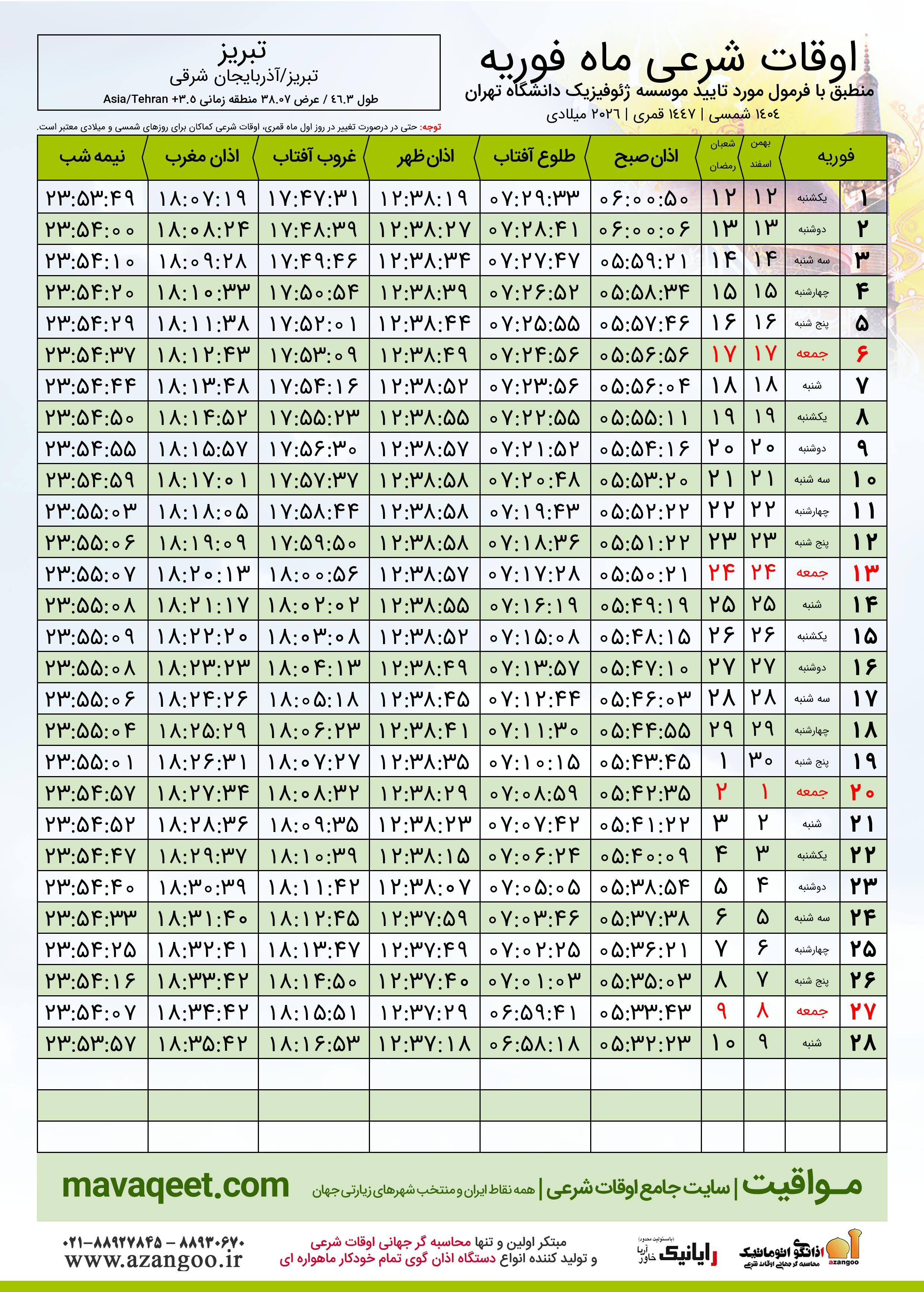 دانلود اوقات شرعی ماه رمضان ٠٤ - ١٤٠٤ شمسی | ٢٠٢٦ میلادی | ١٤٤٧ قمری شهر تبریز