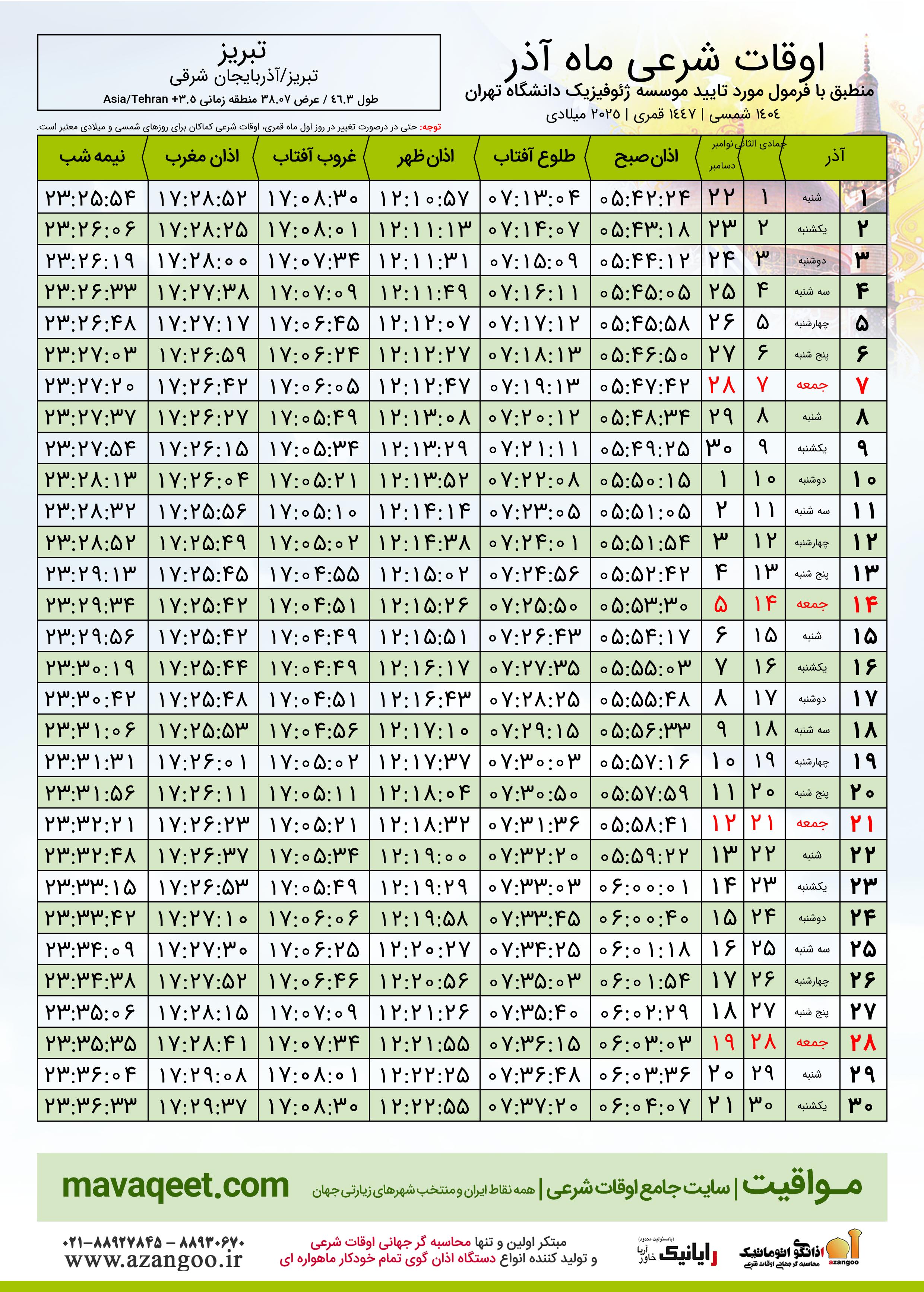 دانلود اوقات شرعی آذر ٠٤ - ١٤٠٤ شهر تبریز