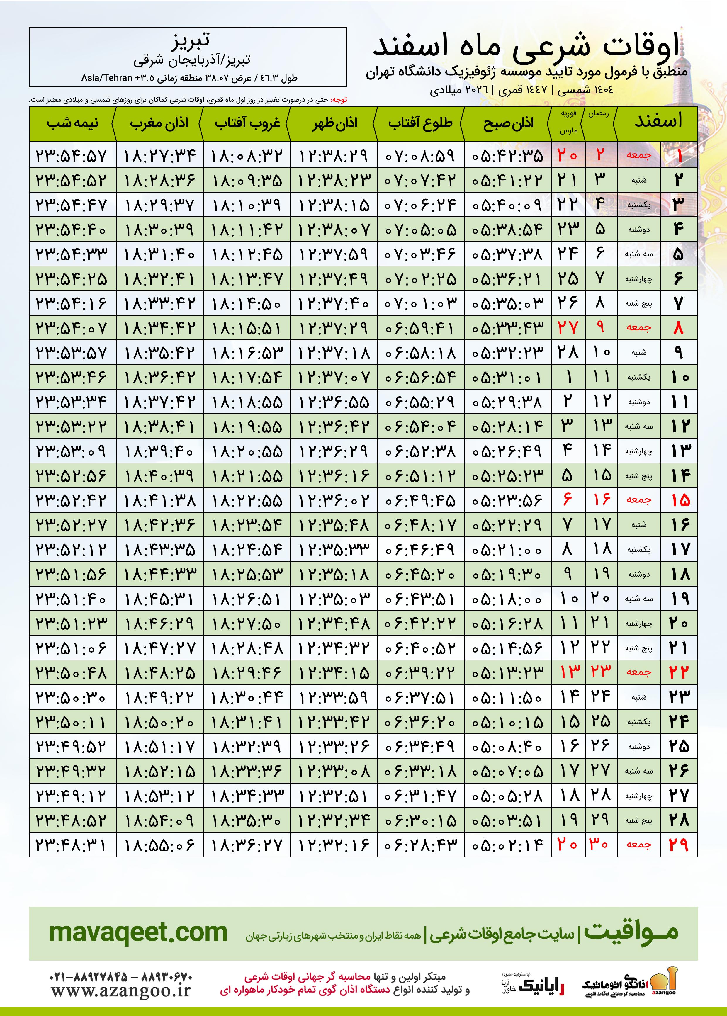 اوقات شرعی اسفند ١٤٠٤ شمسی شهر تبریز