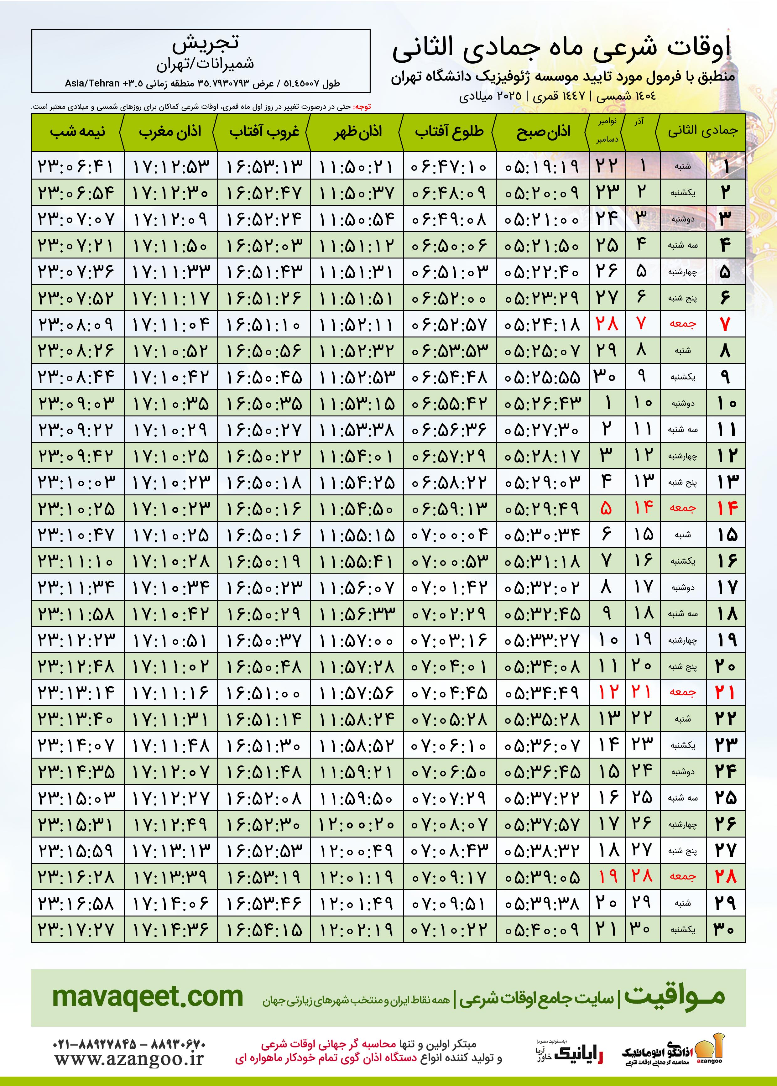 اوقات شرعی ماه جمادی الثانی ١٤٤٧ هـ.ق شهر تجریش بر