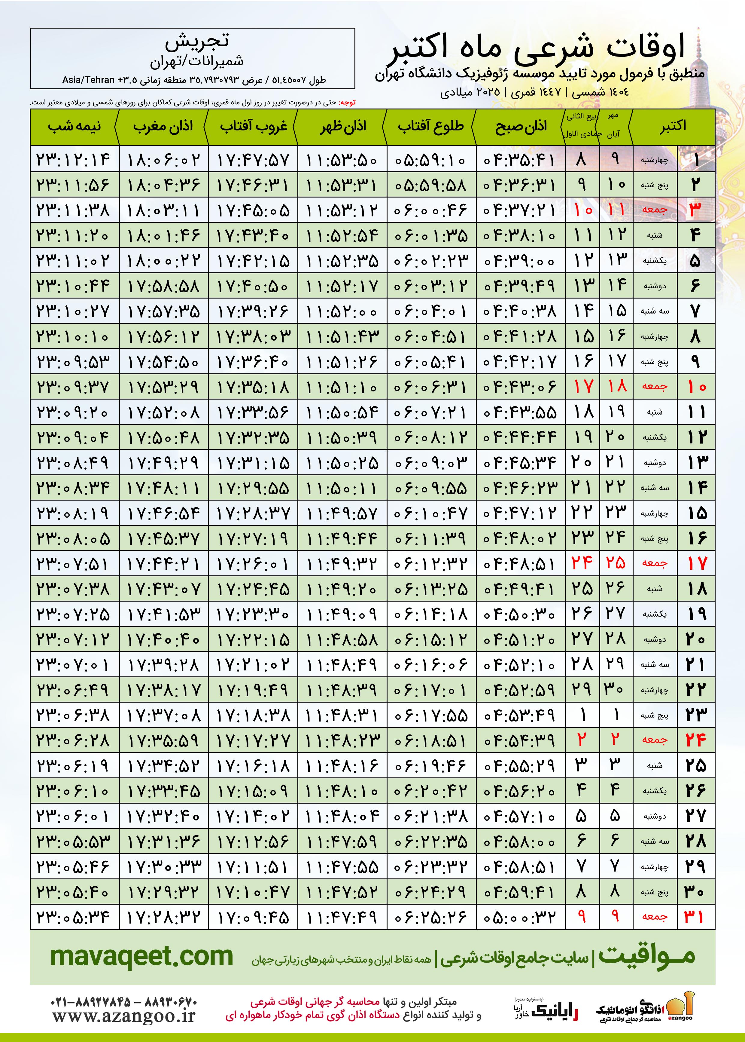اوقات شرعی اکتبر ٢٠٢٥ میلادی شهر تجریش