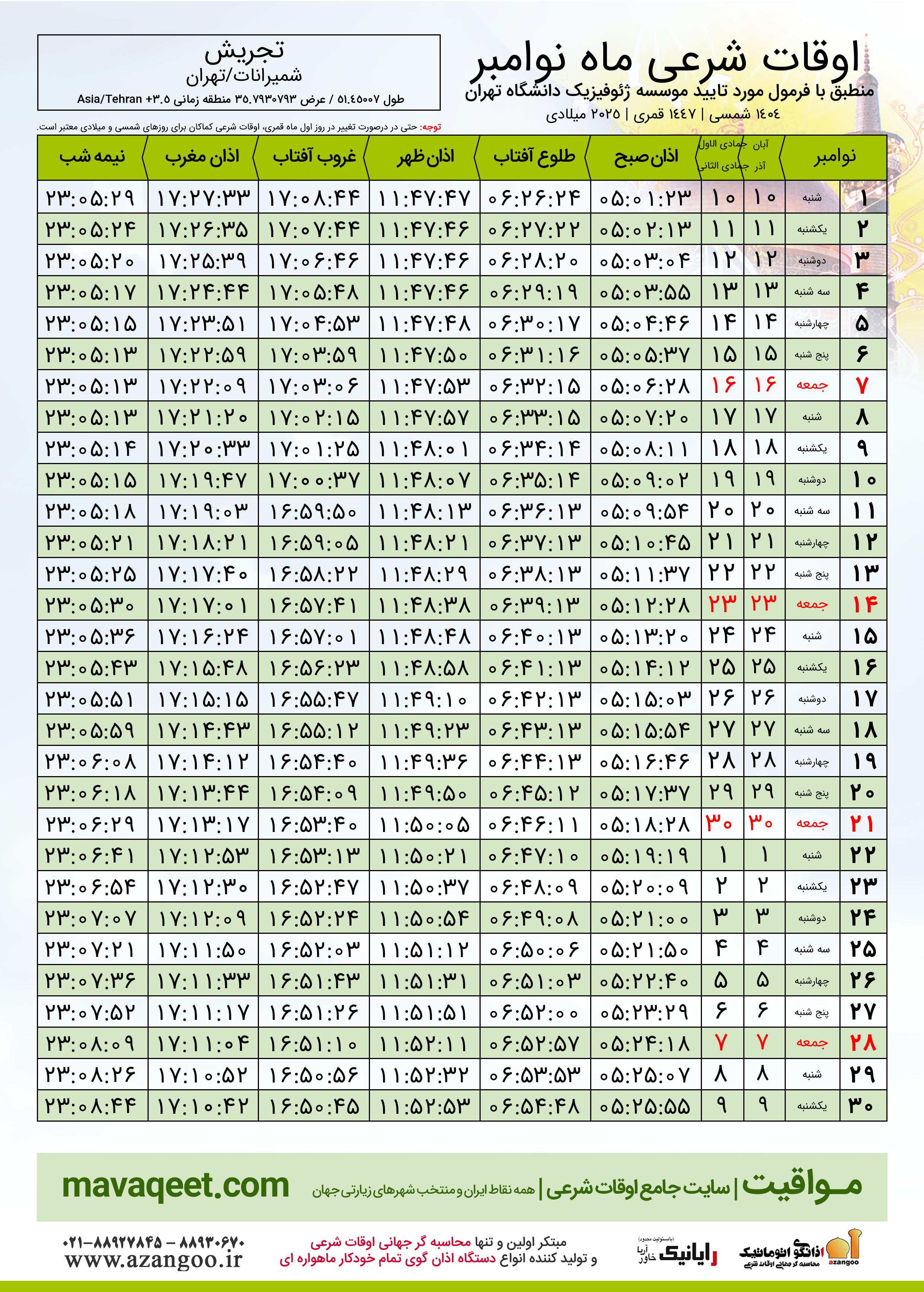 جدول اوقات شرعی نوامبر ٢٠٢٥ میلادی شهر تجریش