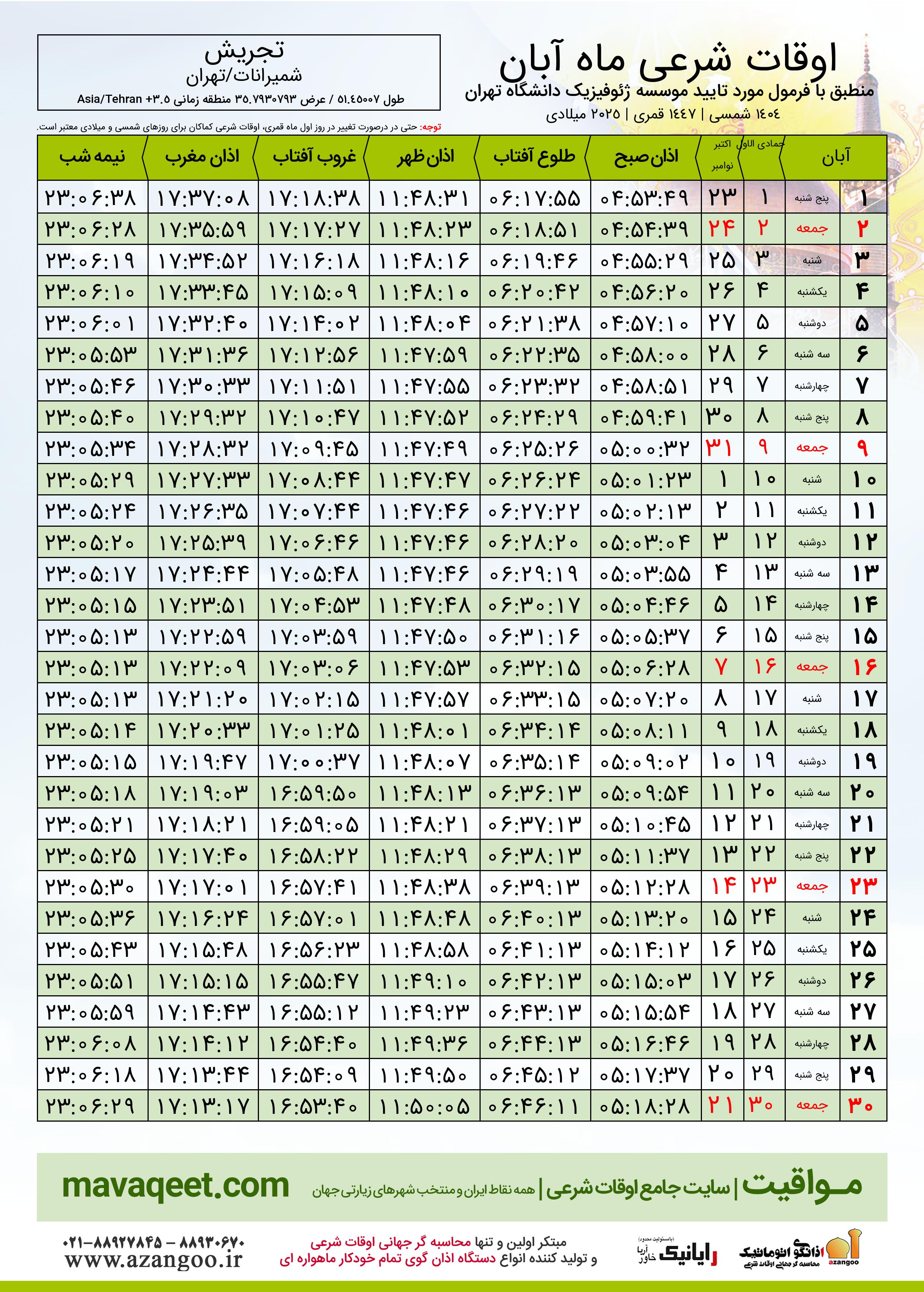 جدول اوقات شرعی آبان ١٤٠٤ شمسی شهر تجریش