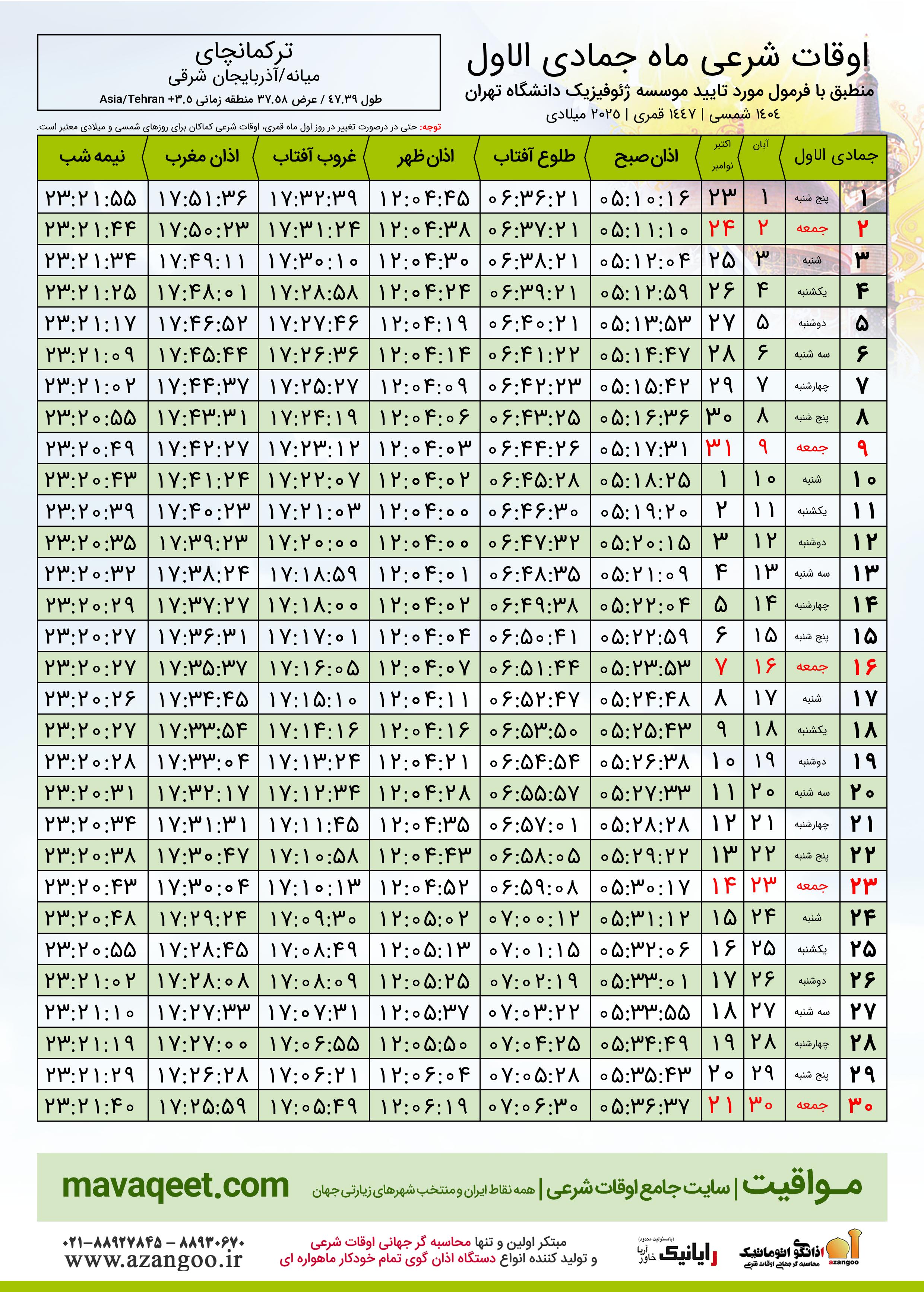 جدول اوقات شرعی جمادی الاول ١٤٤٧ قمری شهر ترکمانچای