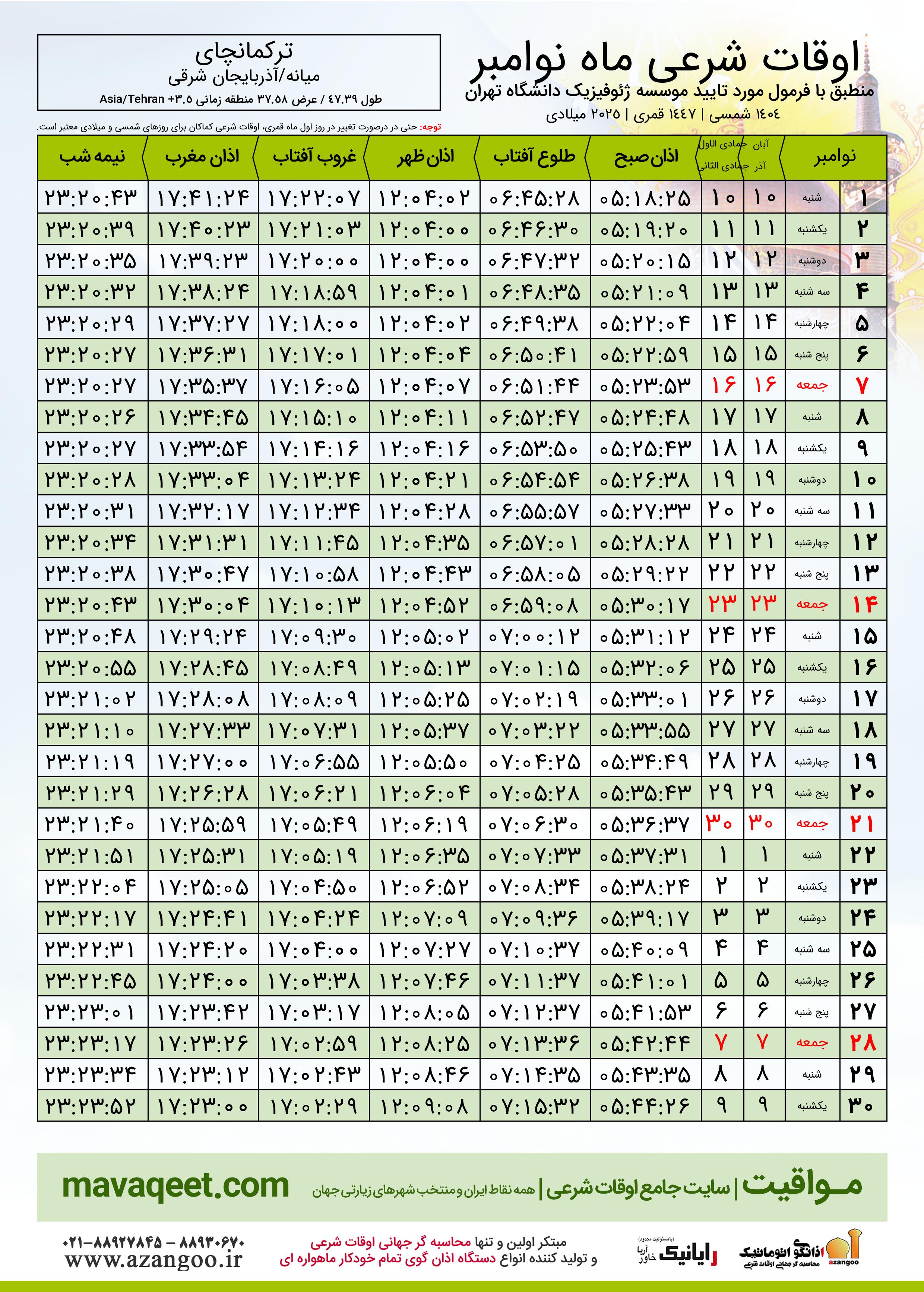 جدول اوقات شرعی نوامبر ٢٠٢٥ میلادی شهر ترکمانچای