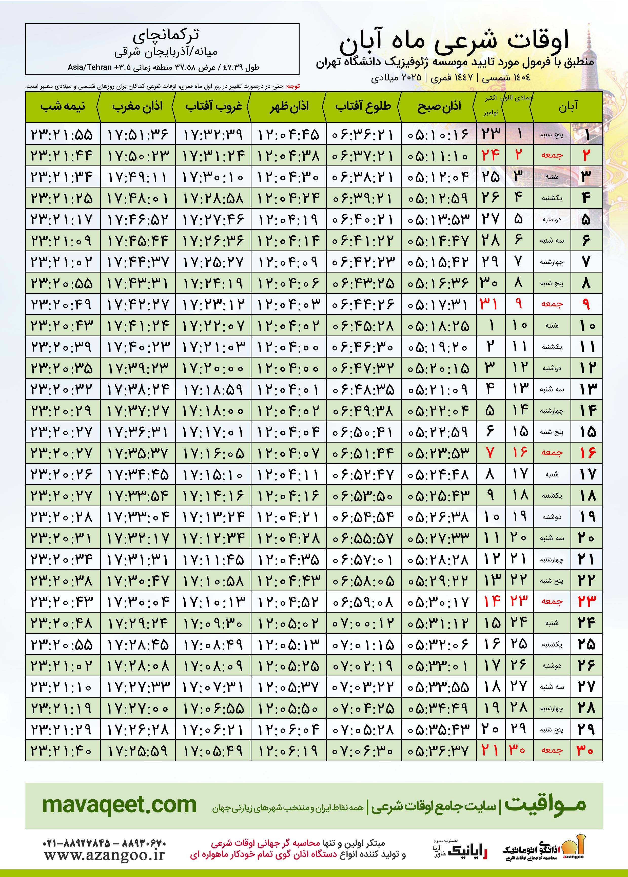 جدول اوقات شرعی آبان ١٤٠٤ شمسی شهر ترکمانچای