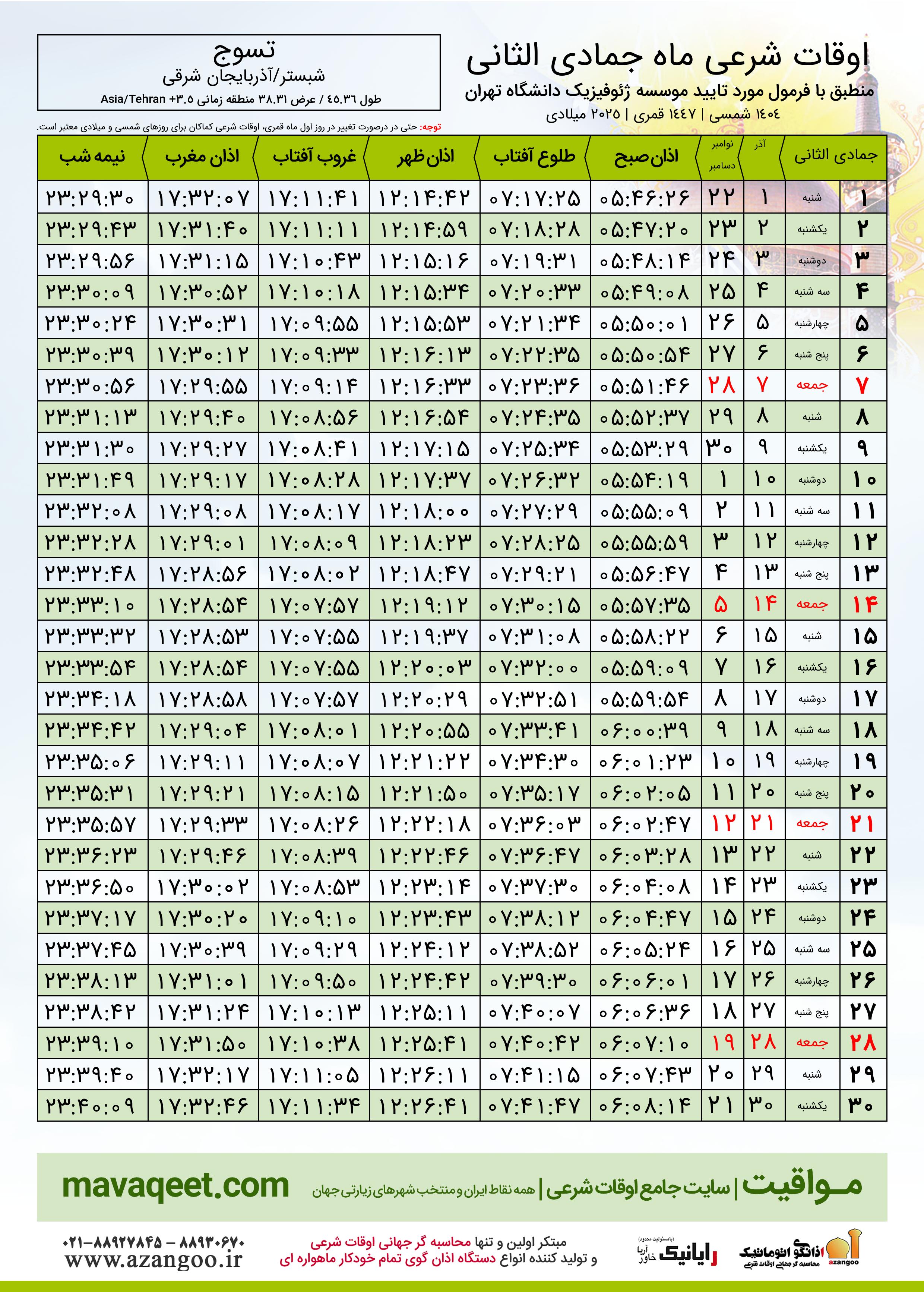 اوقات شرعی ماه جمادی الثانی ١٤٤٧ هـ.ق شهر تسوج بر