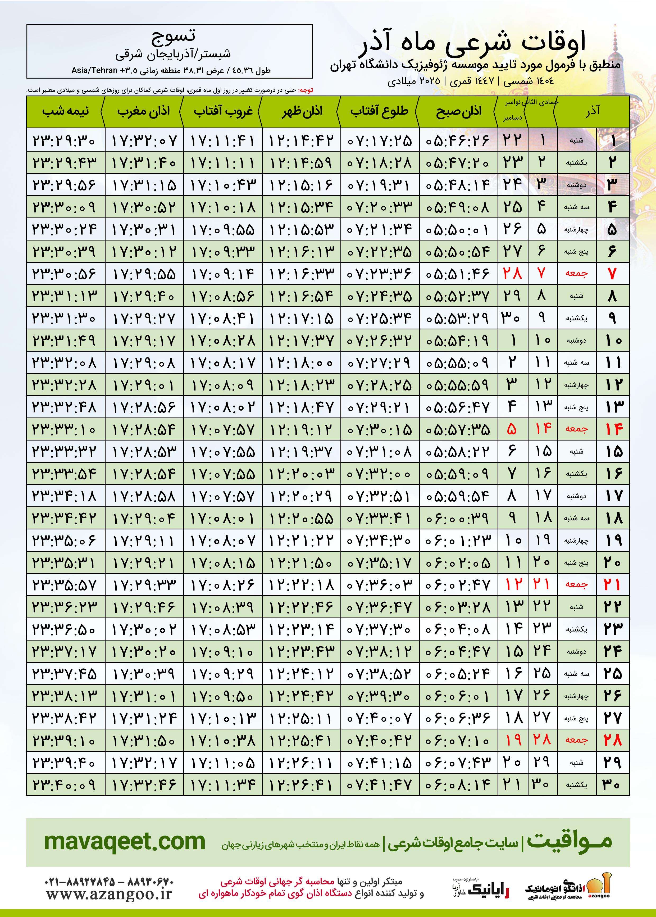 اوقات شرعی آذر ١٤٠٤ شمسی شهر تسوج