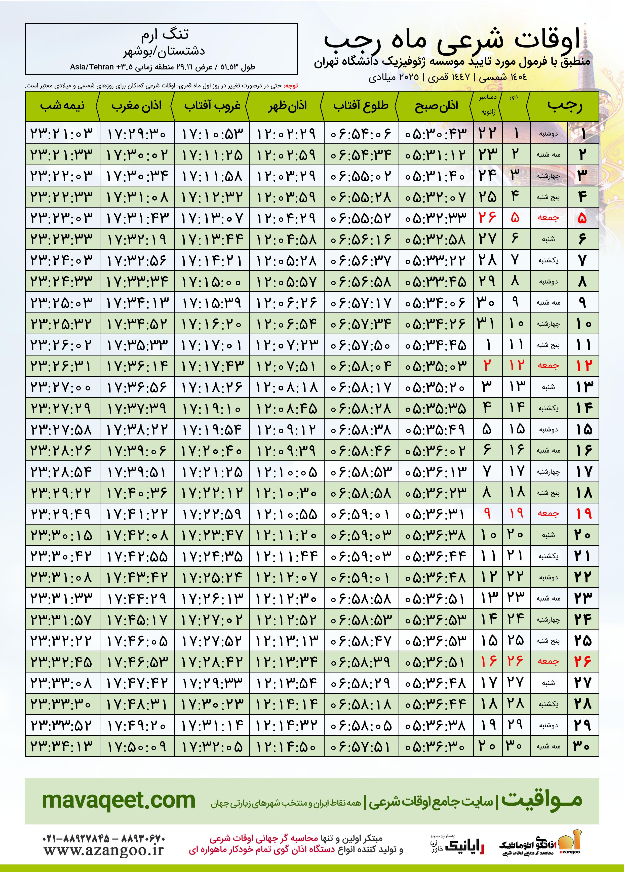 اوقات شرعی ماه رجب ١٤٤٧ هـ.ق شهر تنگ ارم بر