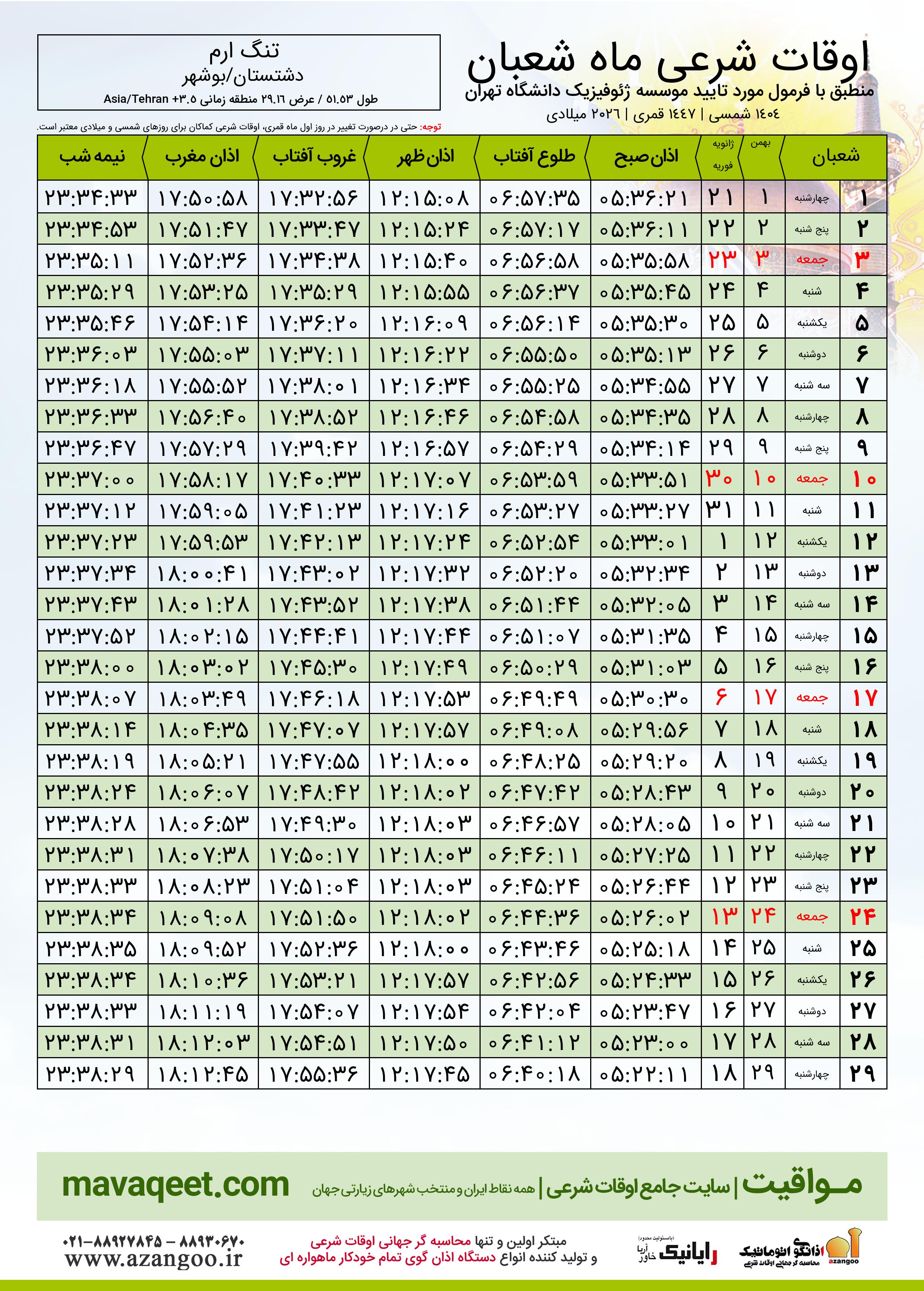 جدول اوقات شرعی شعبان ١٤٤٧ قمری شهر تنگ ارم