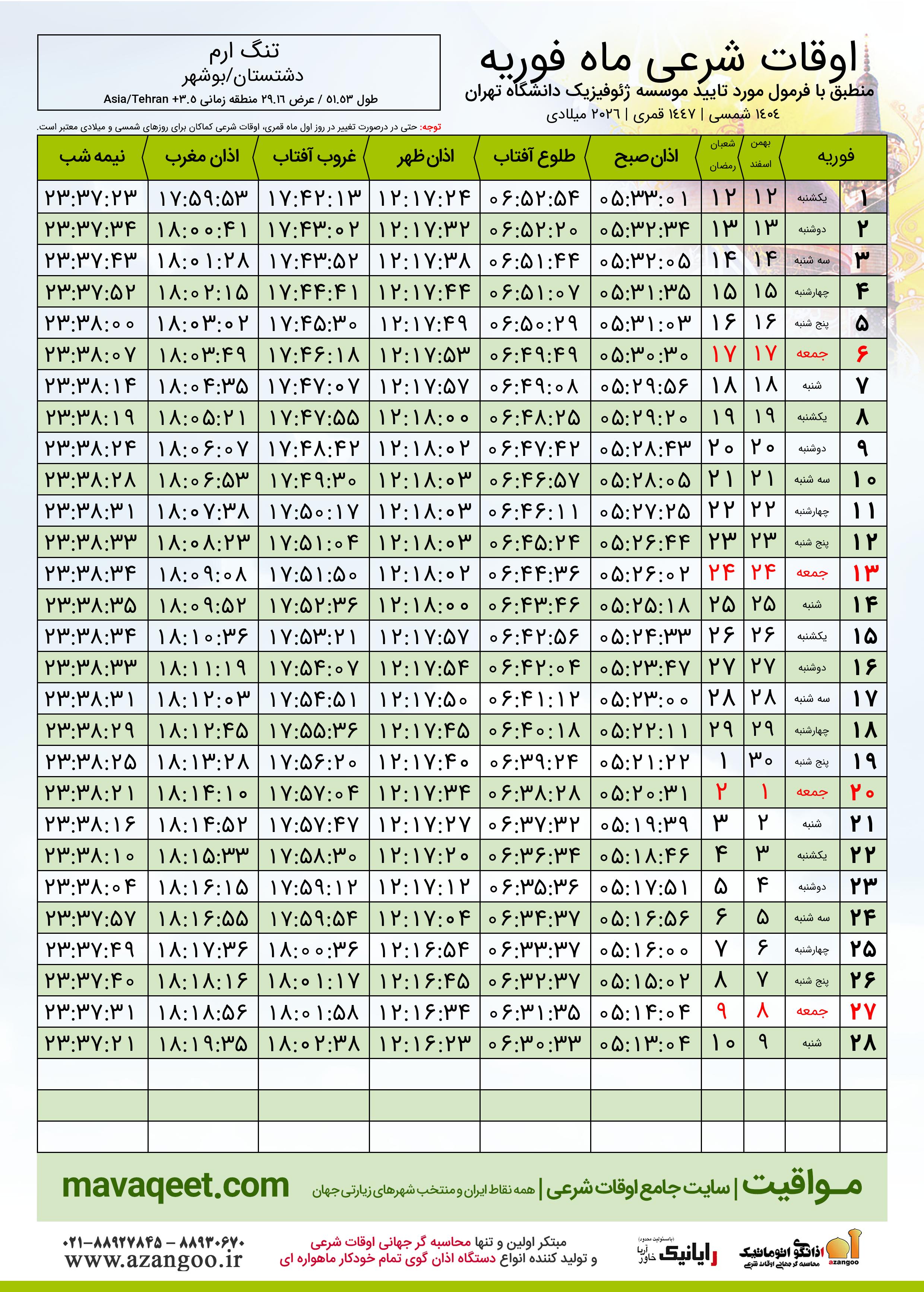 اوقات شرعی فوریه ٢٠٢٦ شهر تنگ ارم + دانلود