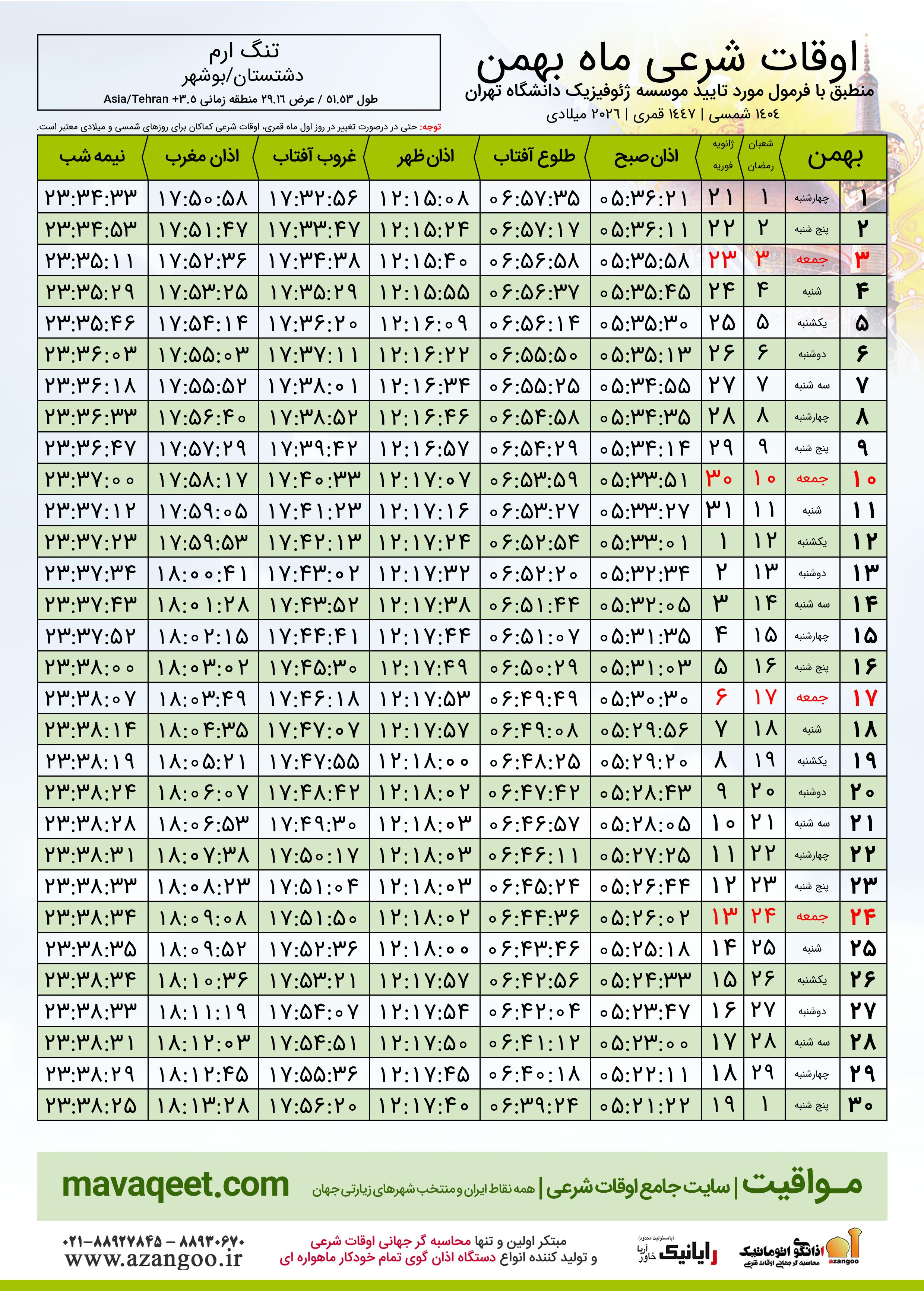 دانلود اوقات شرعی بهمن ٠٤ - ١٤٠٤ شهر تنگ ارم