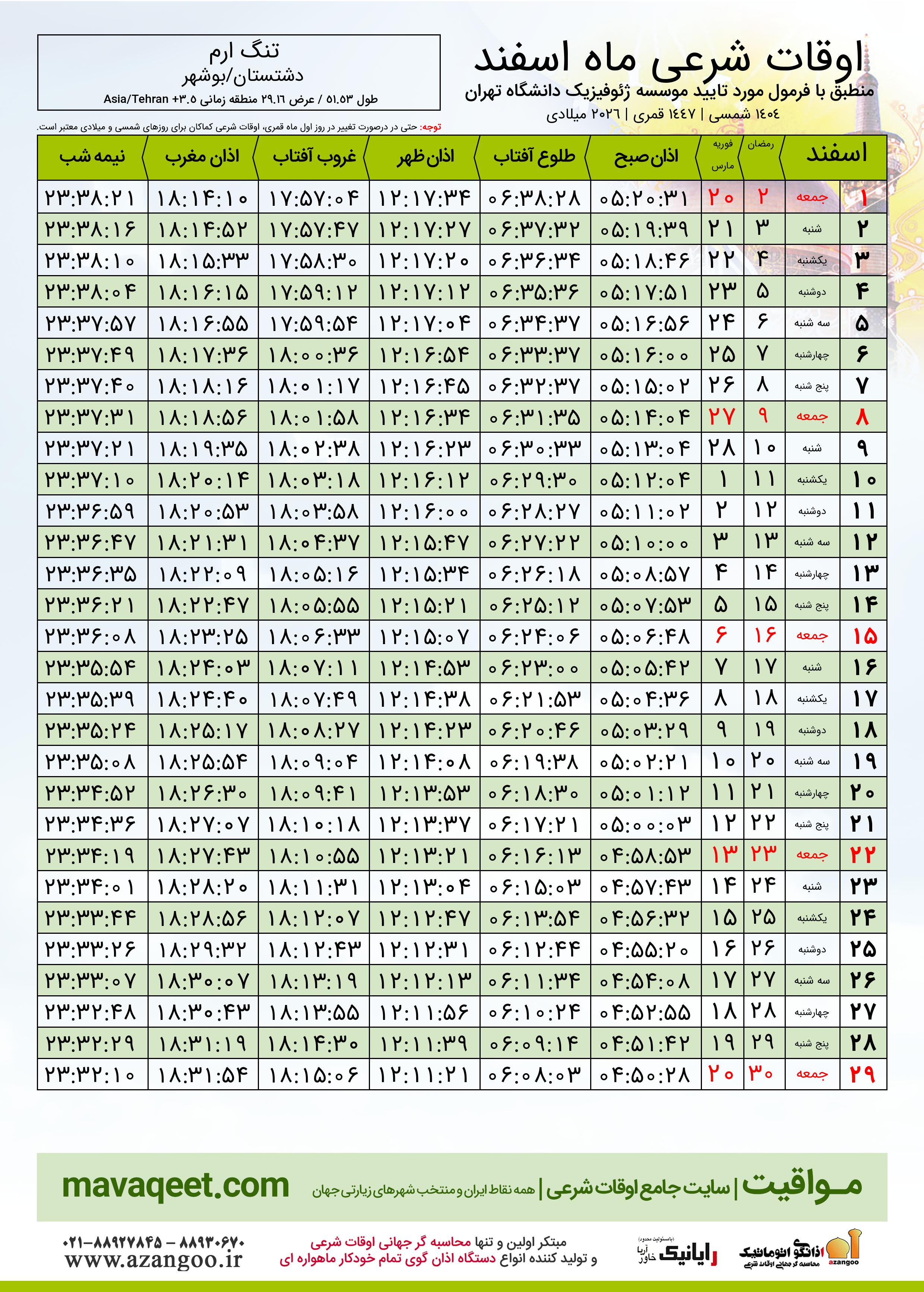 جدول اوقات شرعی ماه رمضان شهر تنگ ارم ٠٤ - ١٤٠٤ شمسی | ٢٠٢٦ میلادی | ١٤٤٧ قمری