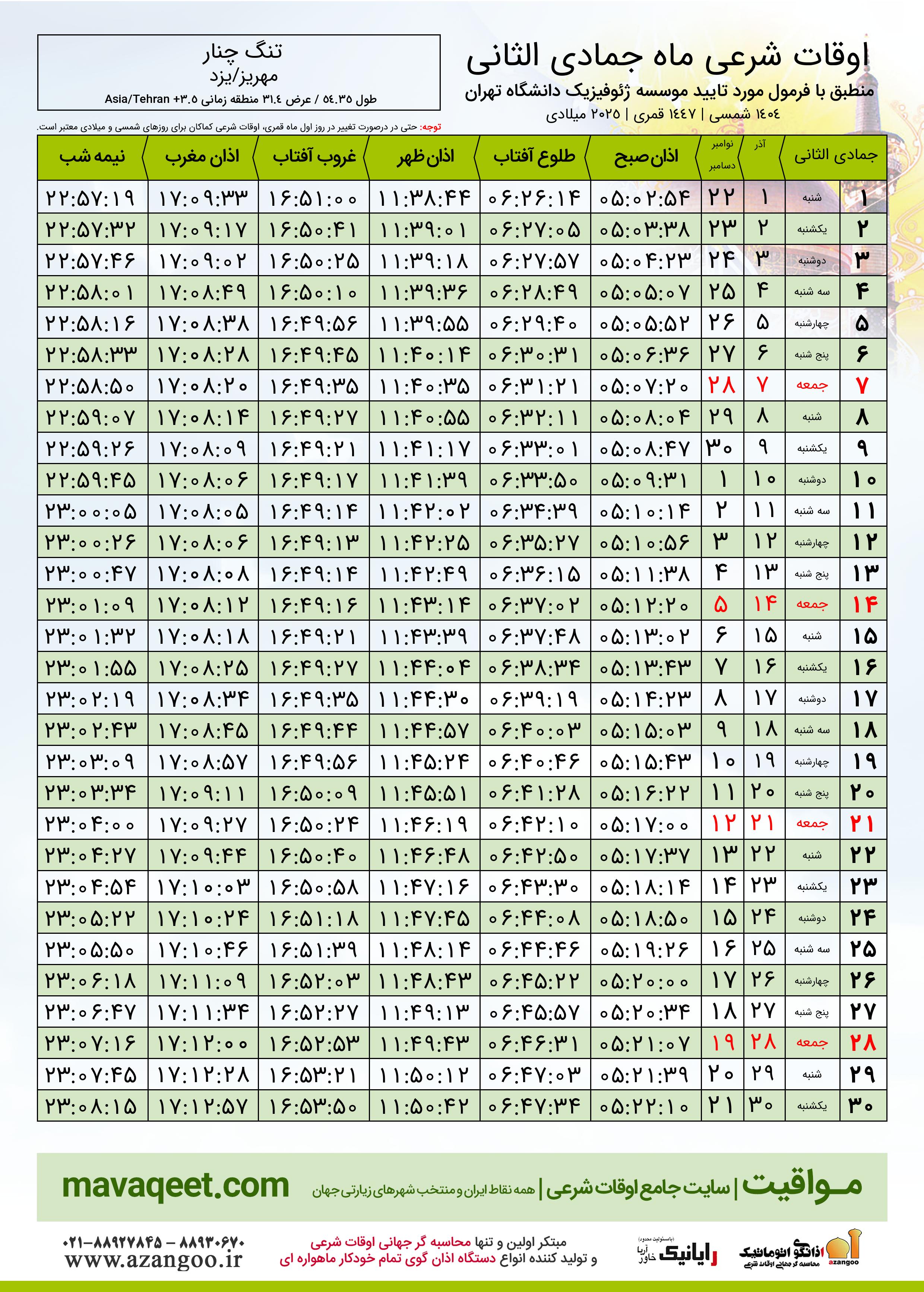 جدول اوقات شرعی جمادی الثانی ١٤٤٧ قمری شهر تنگ چنار