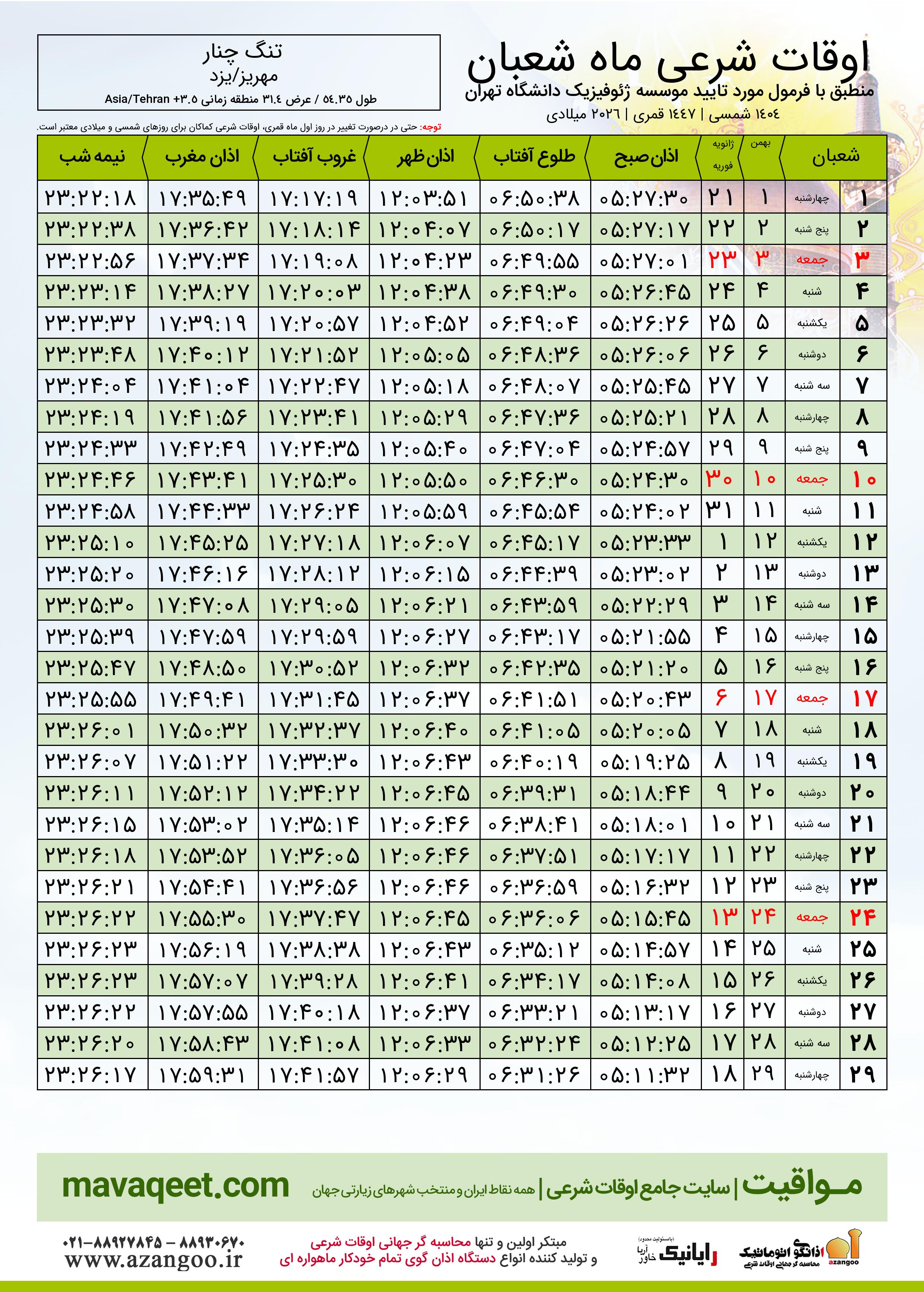 دانلود اوقات شرعی ماه شعبان ١٤٤٧ هـ.ق