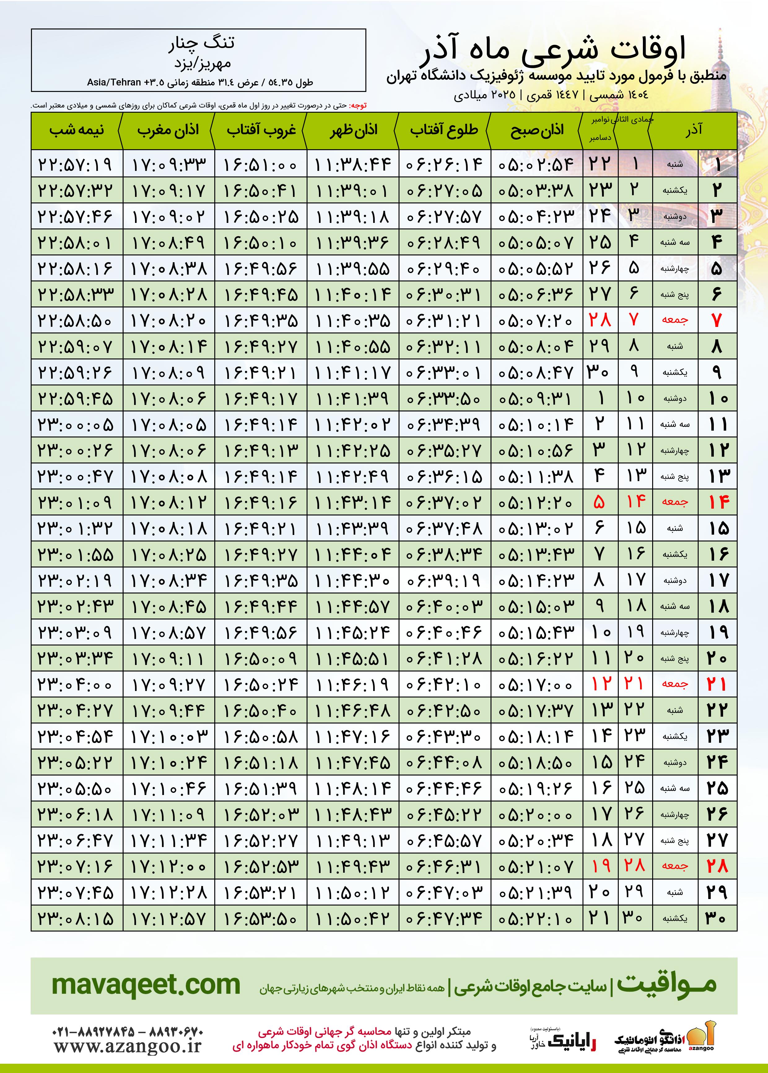 دانلود اوقات شرعی آذر ٠٤ - ١٤٠٤ شهر تنگ چنار