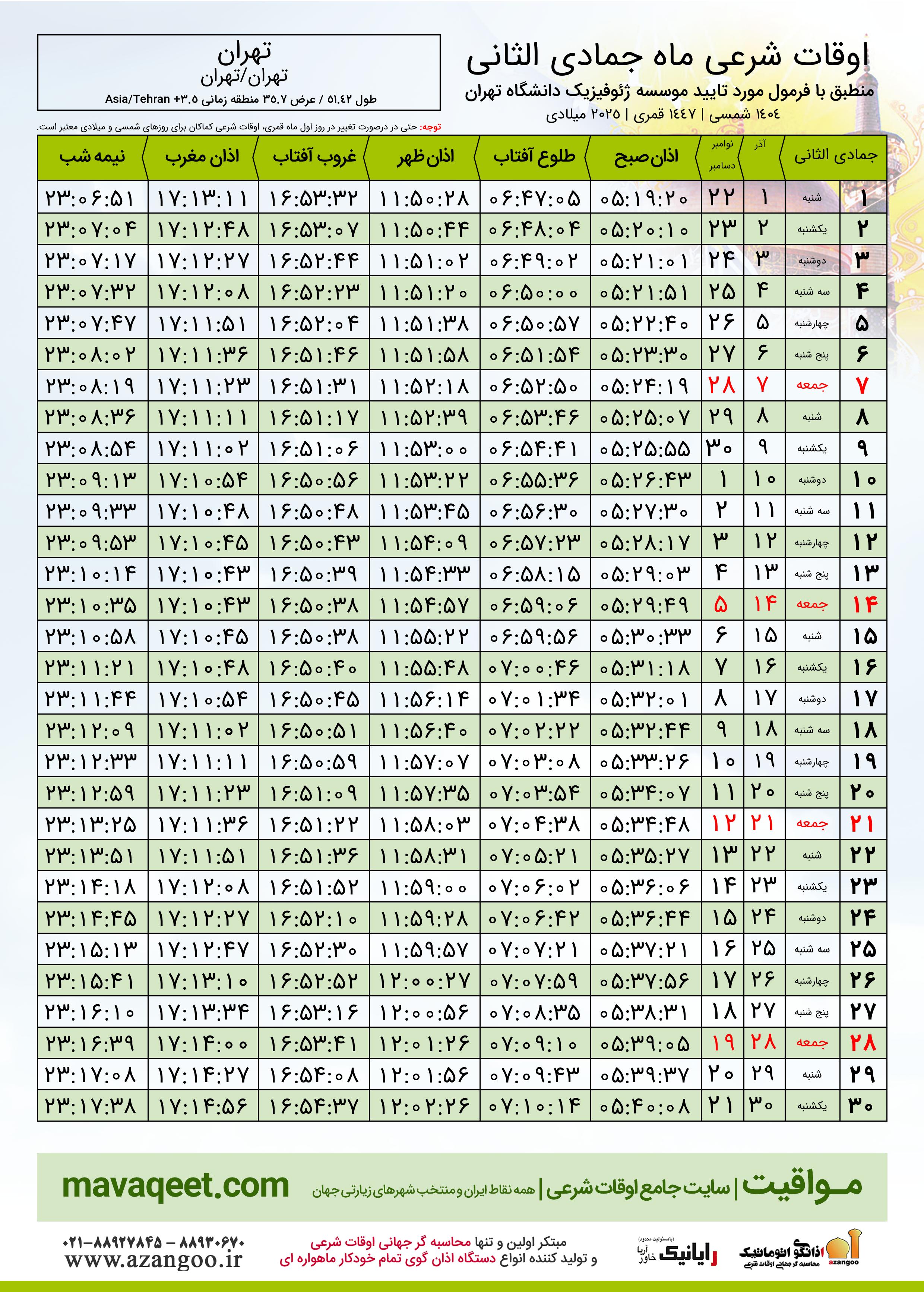 اوقات شرعی ماه جمادی الثانی ١٤٤٧ هـ.ق شهر تهران بر