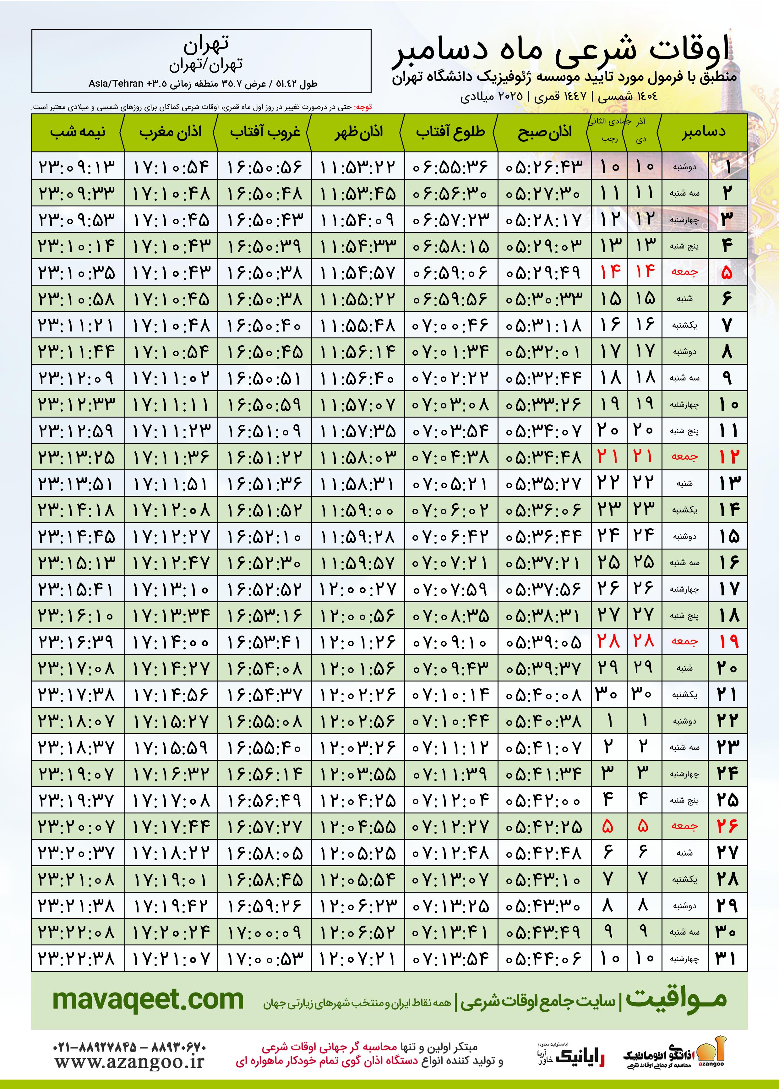 جدول اوقات شرعی آذر ١٤٠٤ شمسی شهر تهران