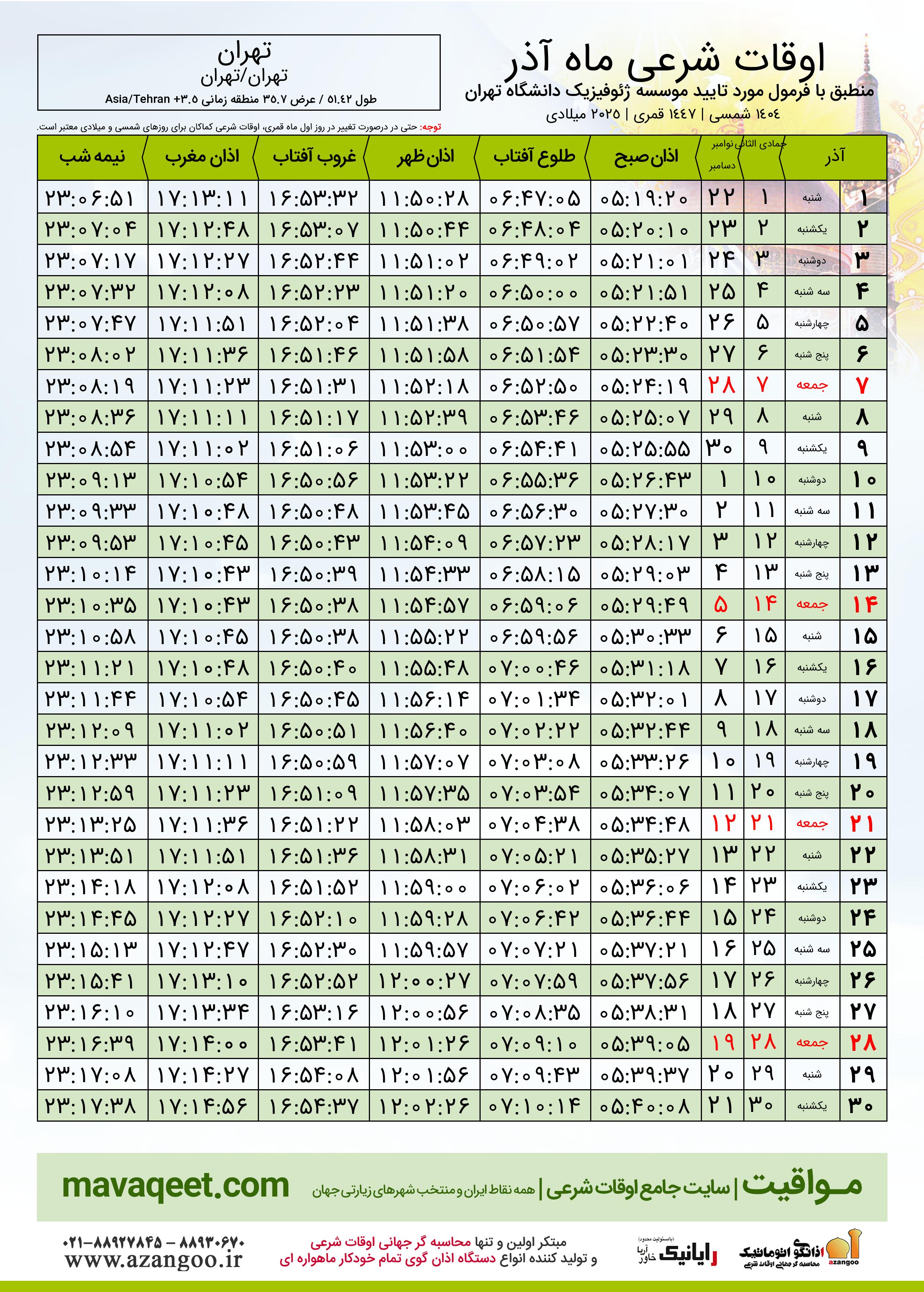 دانلود اوقات شرعی آذر ٠٤ - ١٤٠٤ شهر تهران