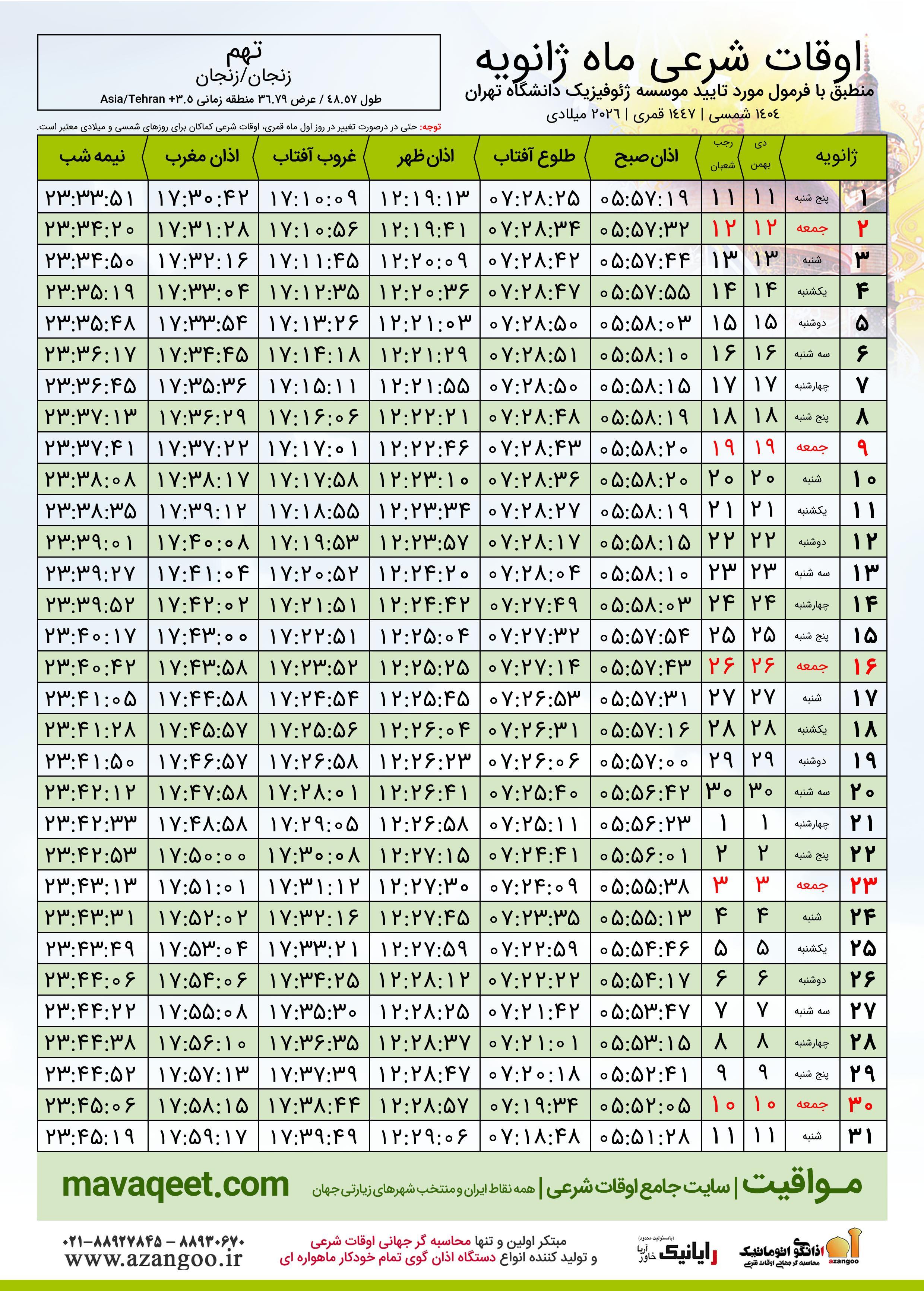 اوقات شرعی ماه رمضان شهر تهم ١٤٠٤ - ٠٤ شمسی | ٢٠٢٦ میلادی