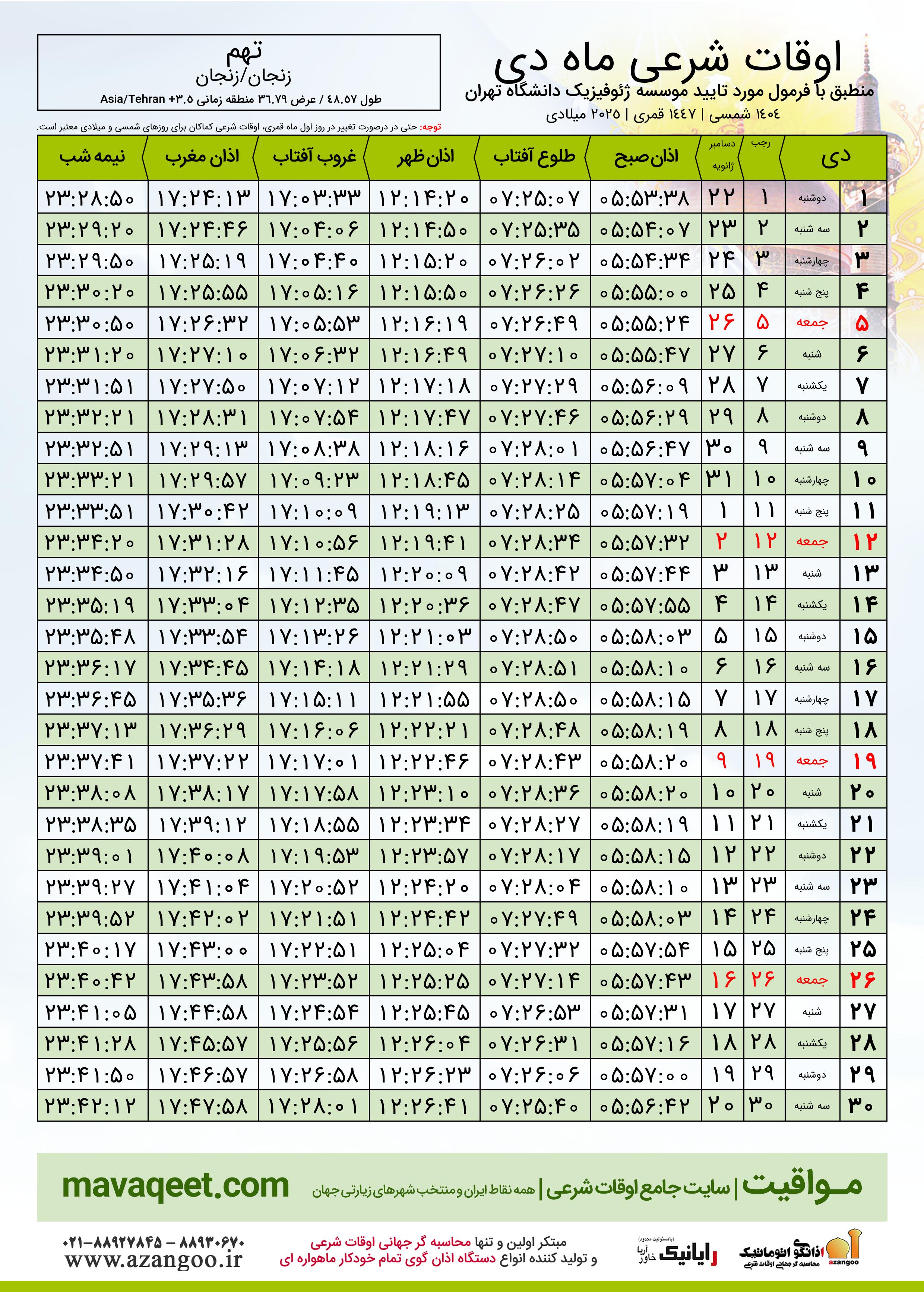 اوقات شرعی دی ١٤٠٤ شمسی شهر تهم