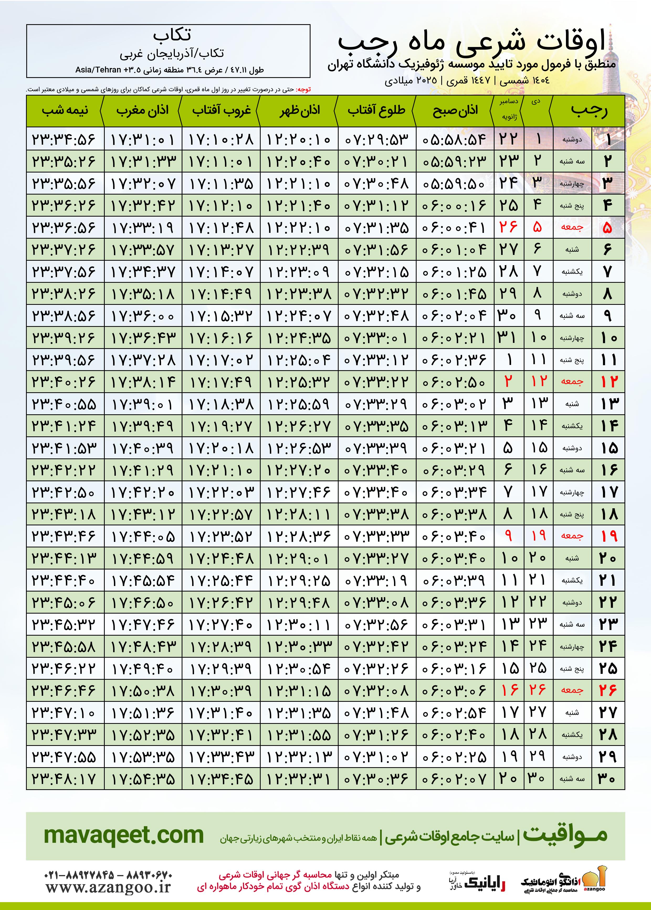 اوقات شرعی ماه رجب ١٤٤٧ هـ.ق شهر تکاب بر