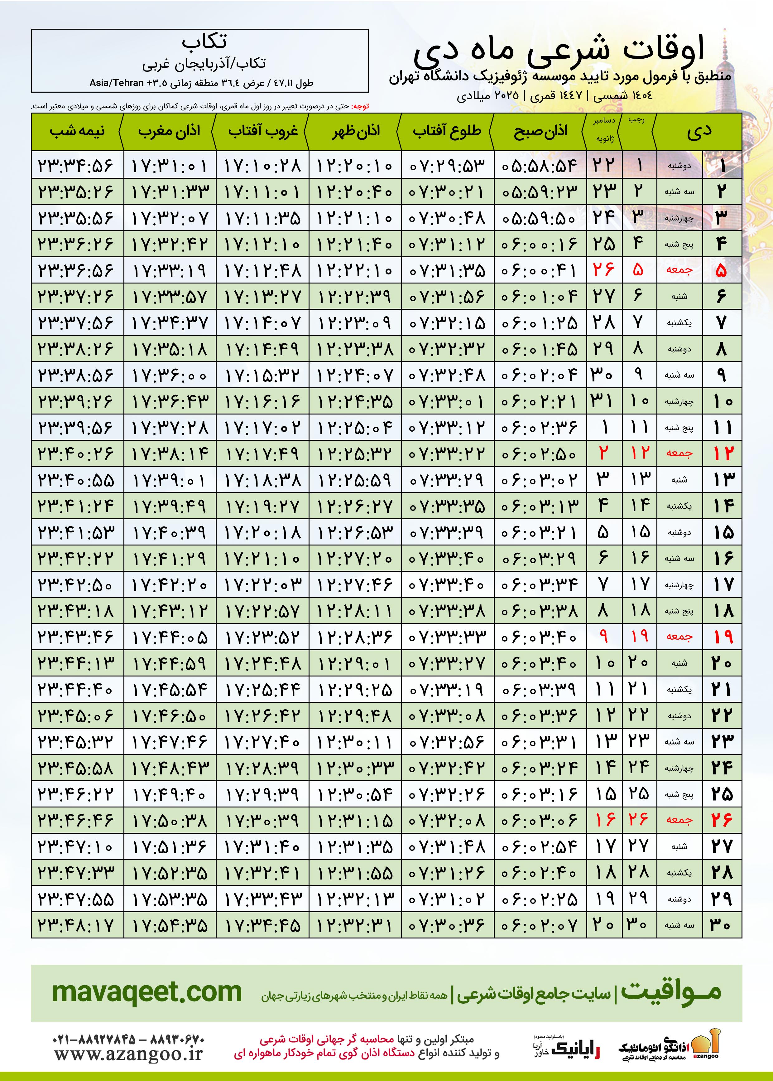 اوقات شرعی دسامبر ٢٠٢٥ میلادی شهر تکاب