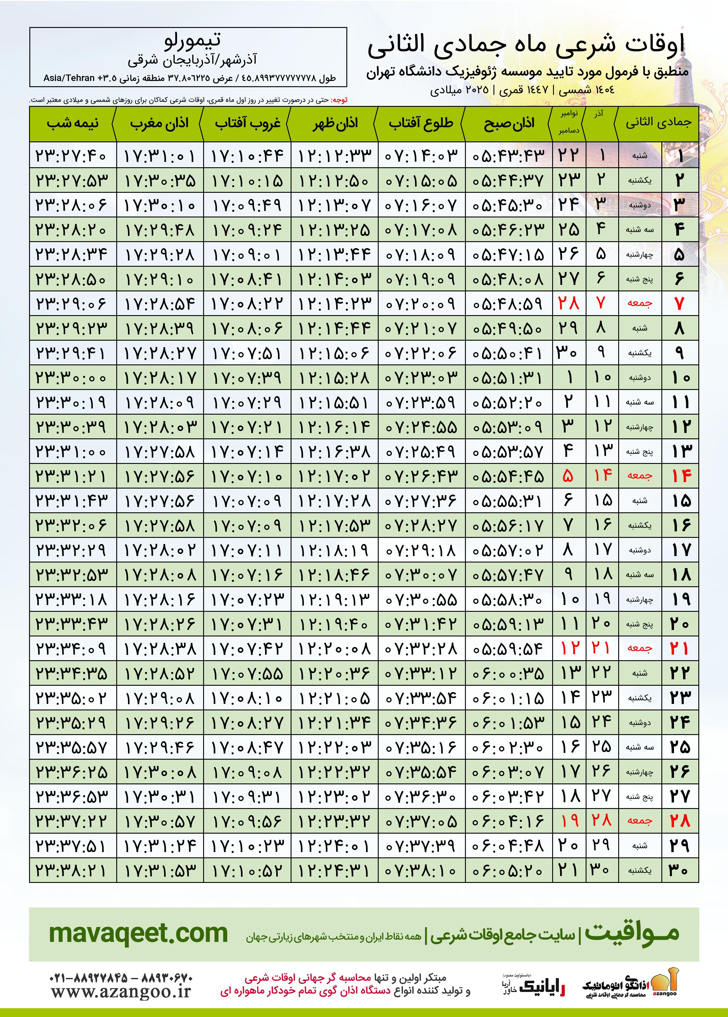 جدول اوقات شرعی جمادی الثانی ١٤٤٧ قمری شهر تیمورلو