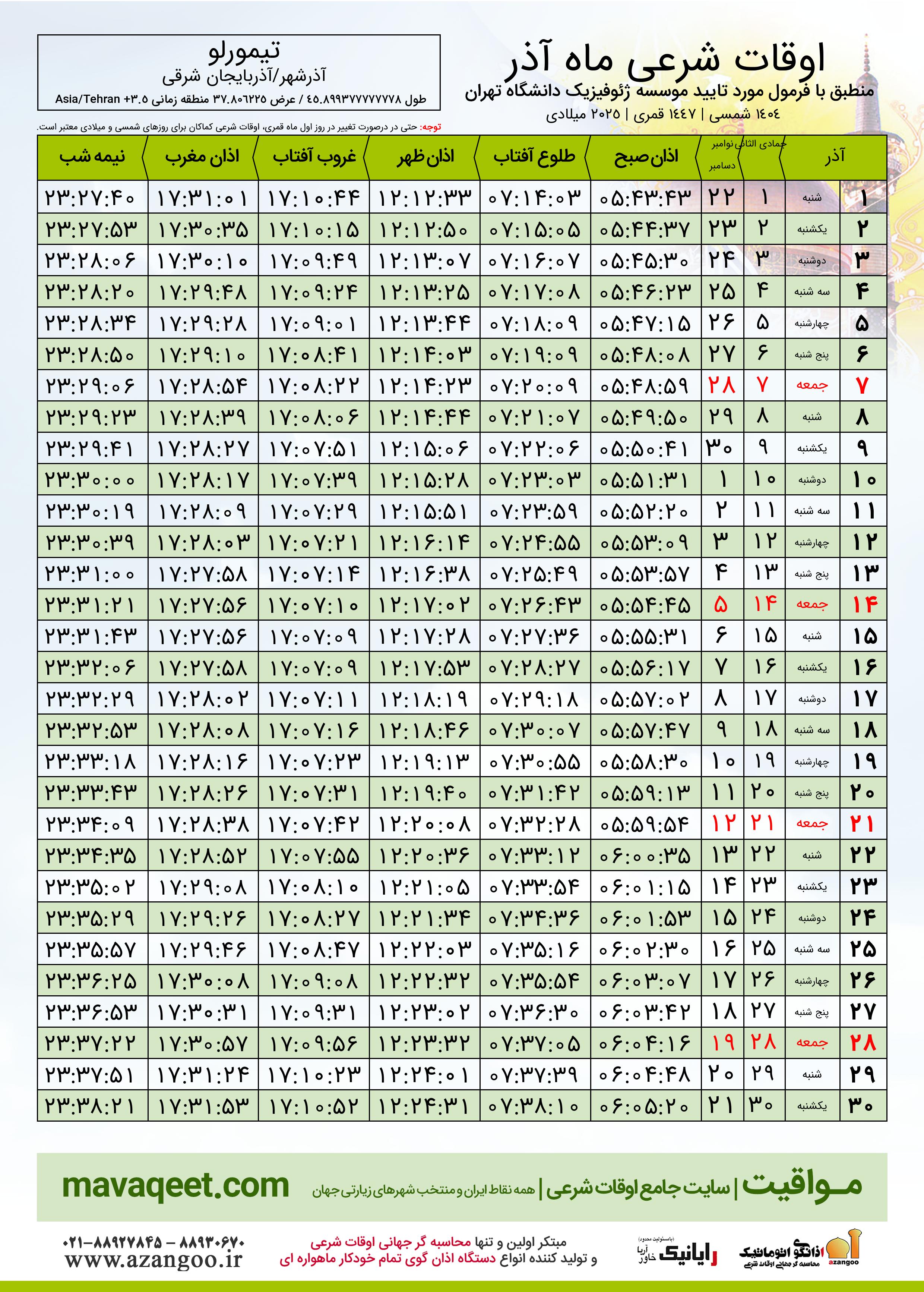 جدول اوقات شرعی آذر ١٤٠٤ شمسی شهر تیمورلو