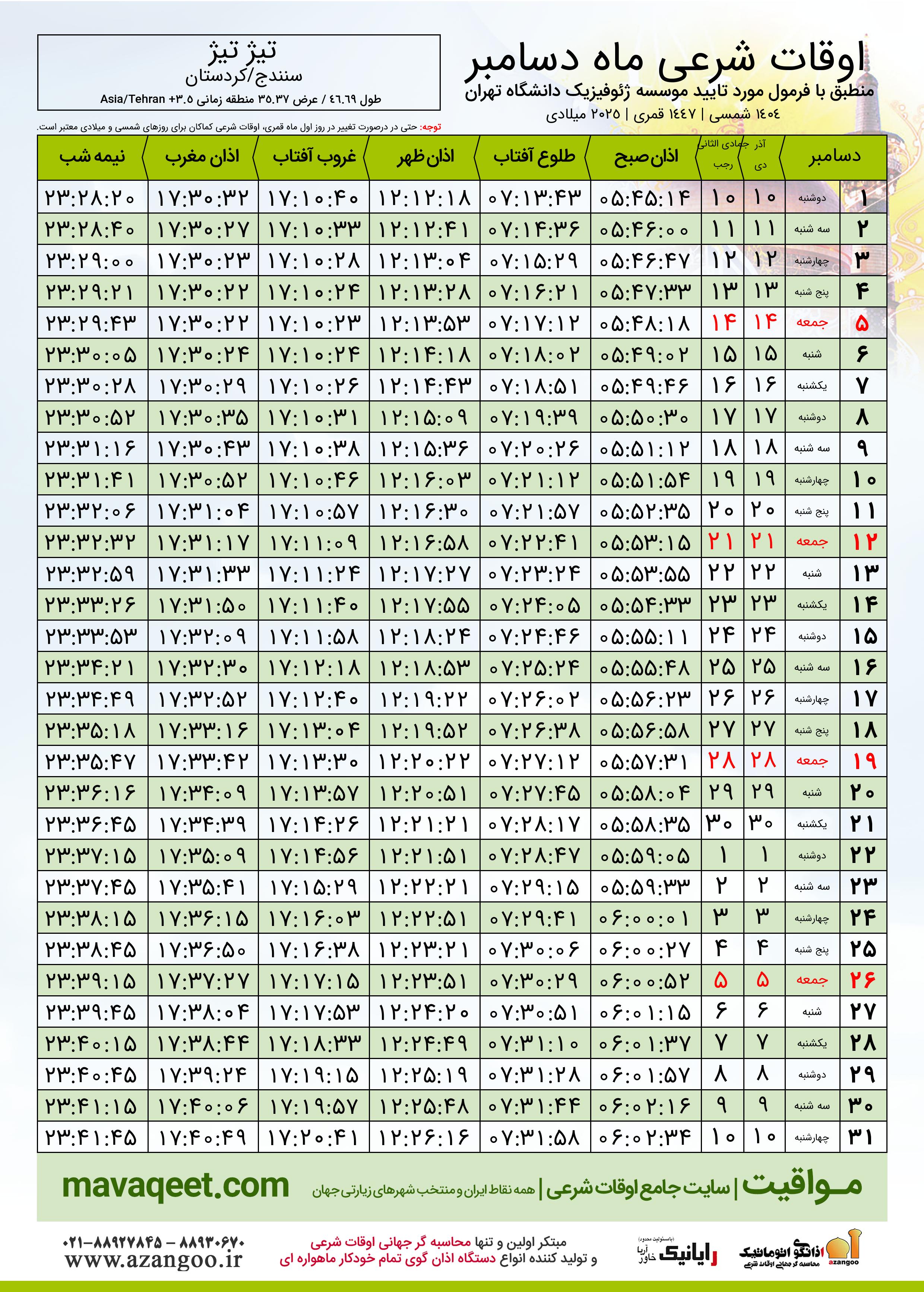 جدول اوقات شرعی دسامبر ٢٠٢٥ میلادی شهر تیژ تیژ