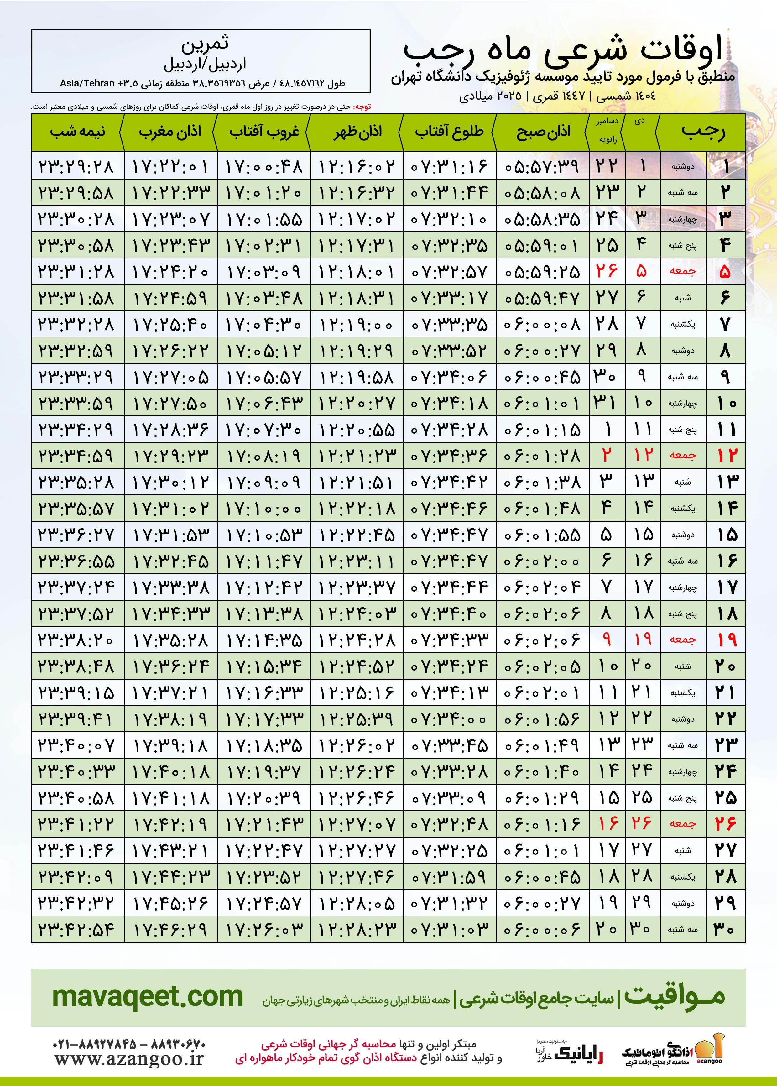 اوقات شرعی ماه رجب ١٤٤٧ هـ.ق شهر ثمرین بر