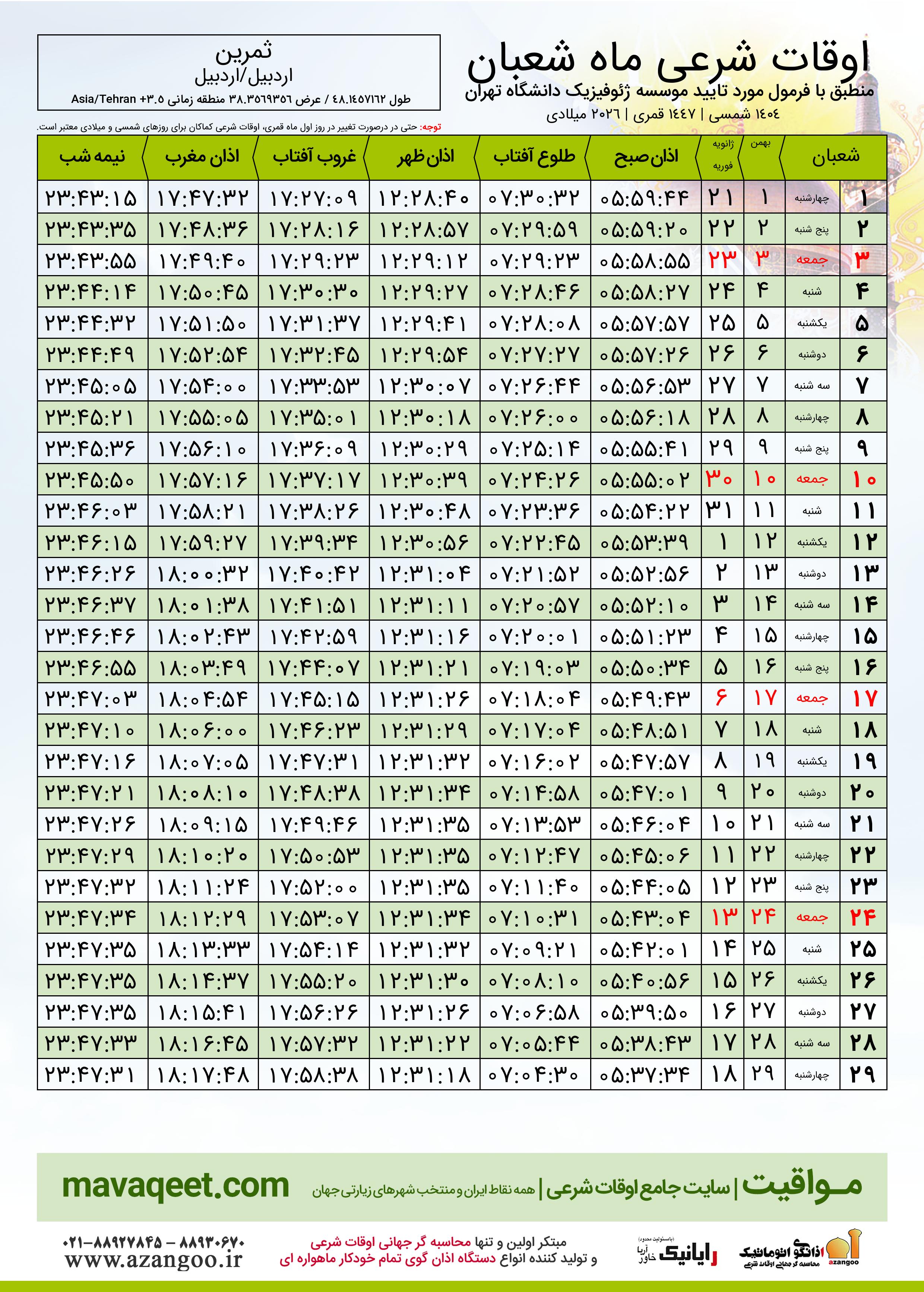 جدول اوقات شرعی شعبان ١٤٤٧ قمری شهر ثمرین