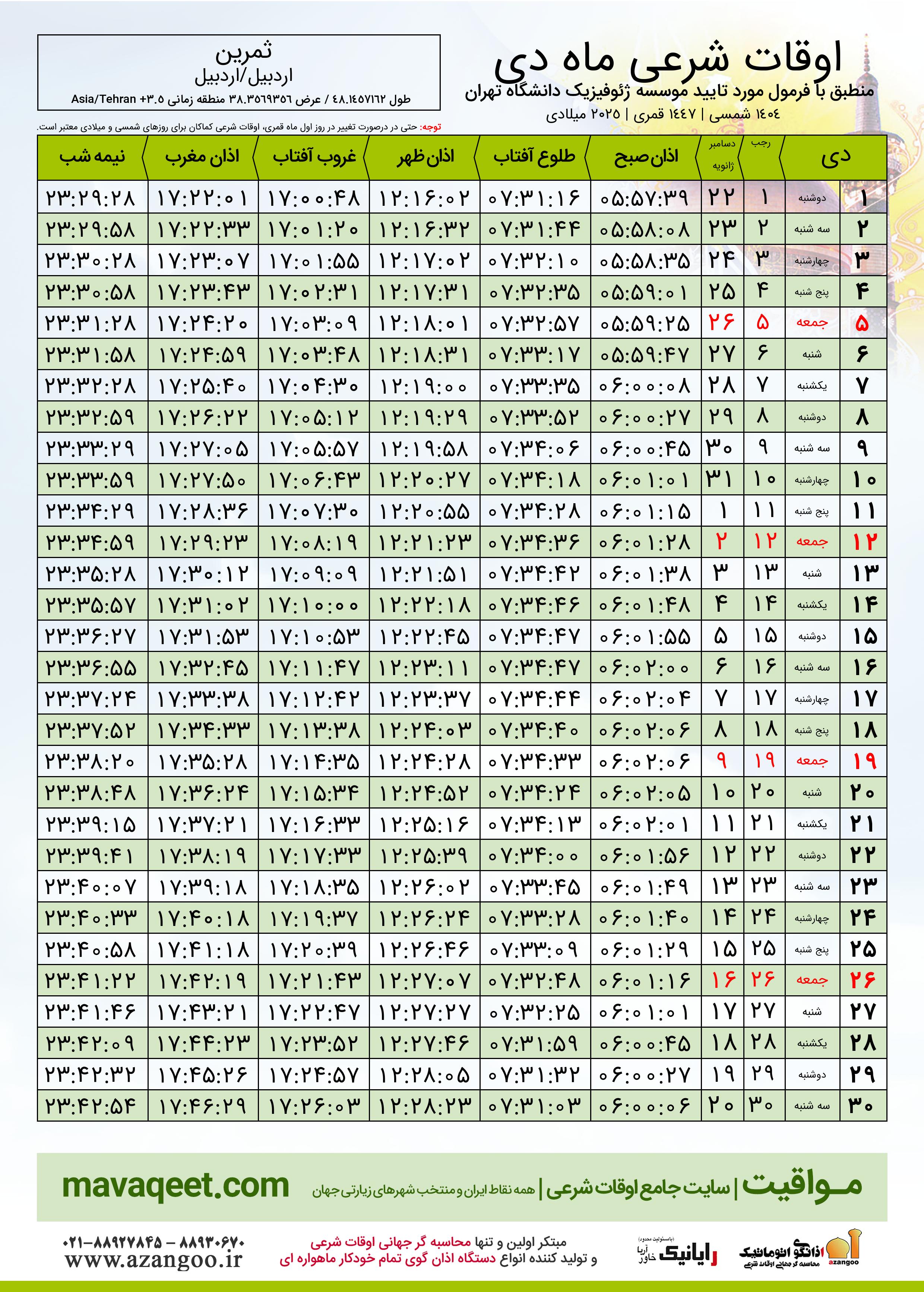 اوقات شرعی دی ١٤٠٤ شمسی شهر ثمرین