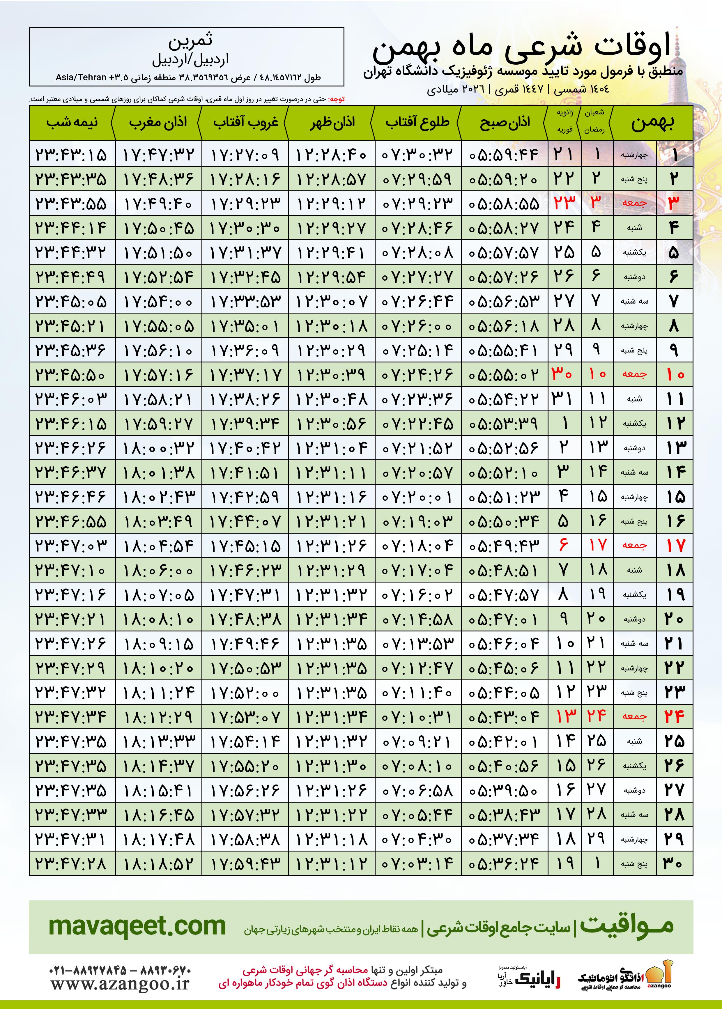اوقات شرعی بهمن ٠٤ | اوقات شرعی فوریه ٢٦ | اوقات شرعی شعبان ١٤٤٧ | + اوقات شرعی رمضان ٤