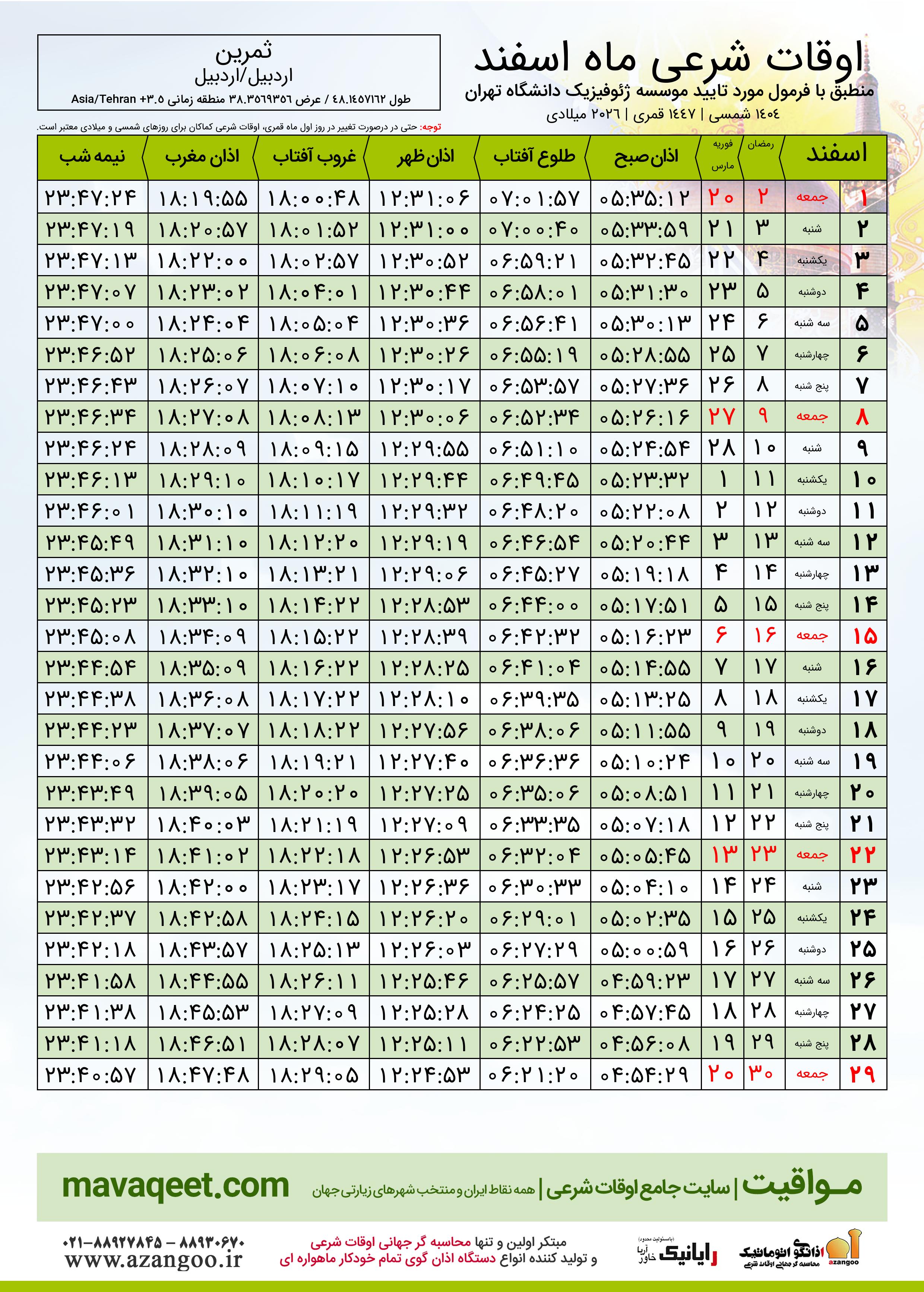جدول اوقات شرعی اسفند ١٤٠٤ شمسی شهر ثمرین