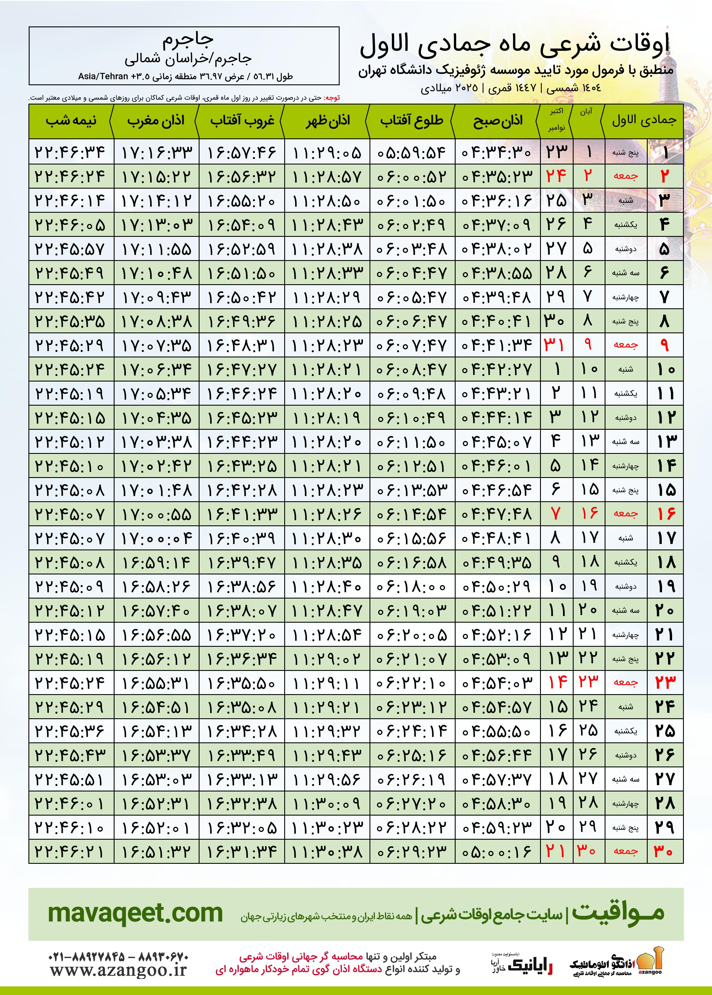 اوقات شرعی ماه جمادی الاول ١٤٤٧ هـ.ق شهر جاجرم بر