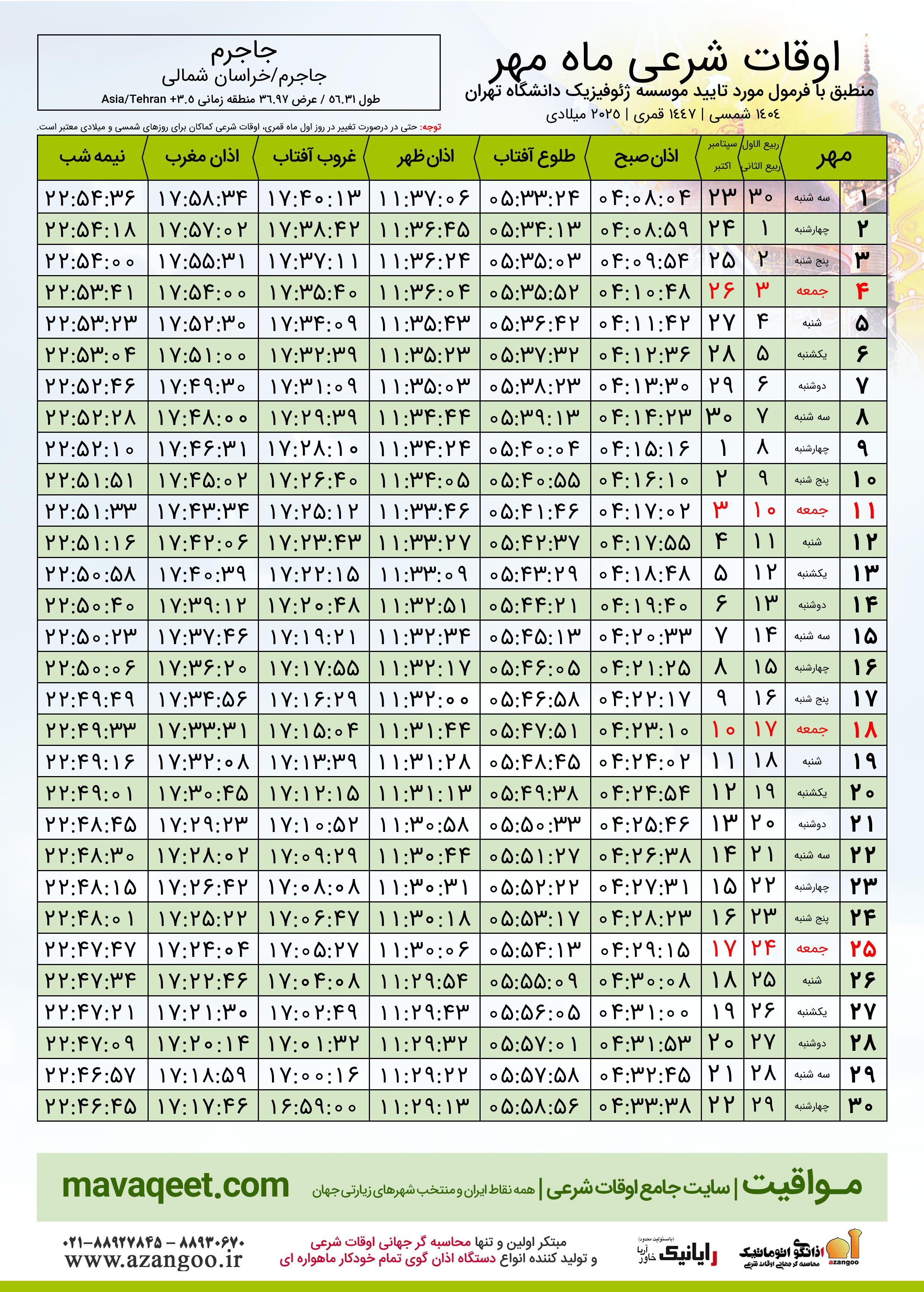 اوقات شرعی مهر ١٤٠٤ شمسی شهر جاجرم