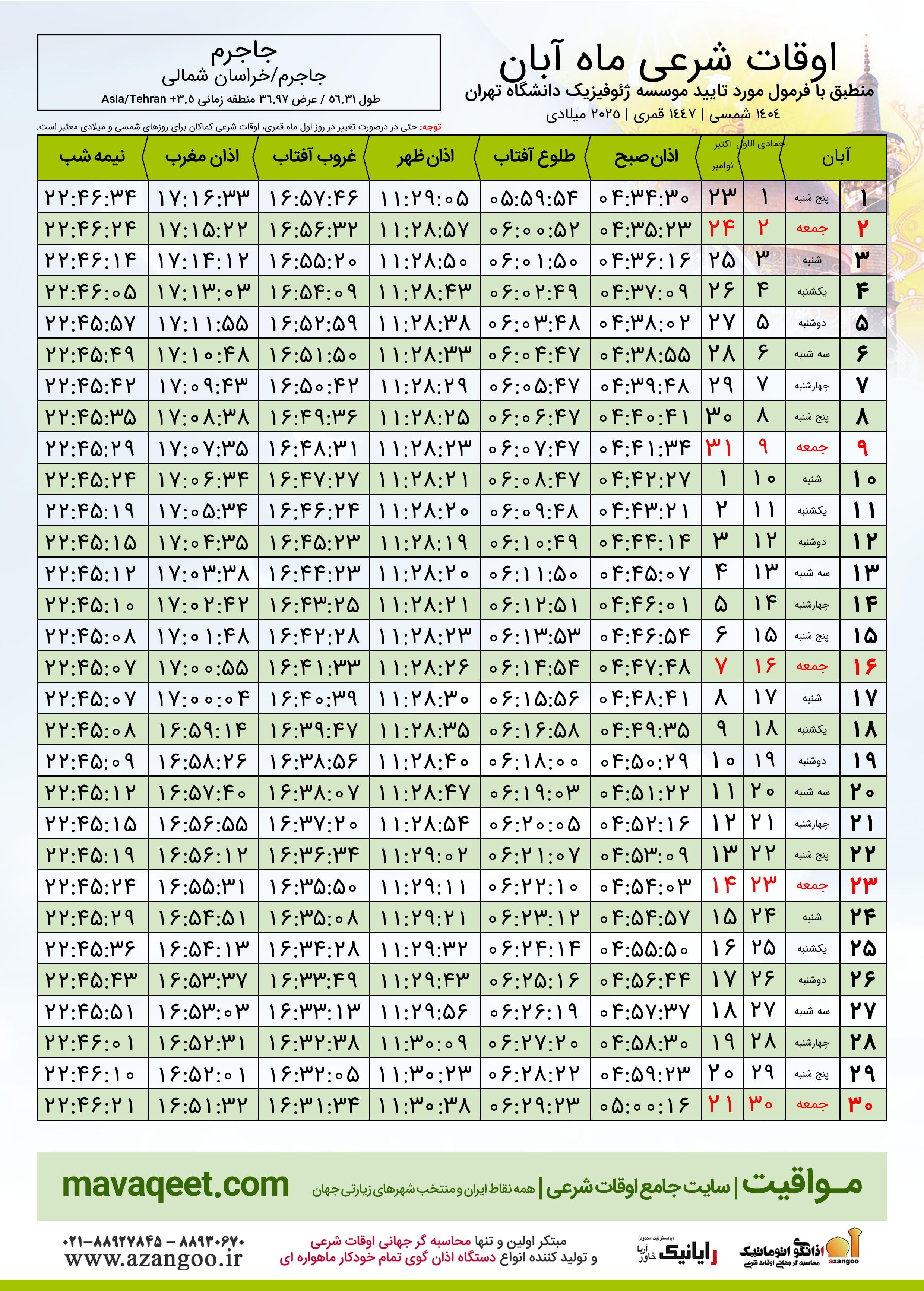 جدول اوقات شرعی آبان ١٤٠٤ شمسی شهر جاجرم