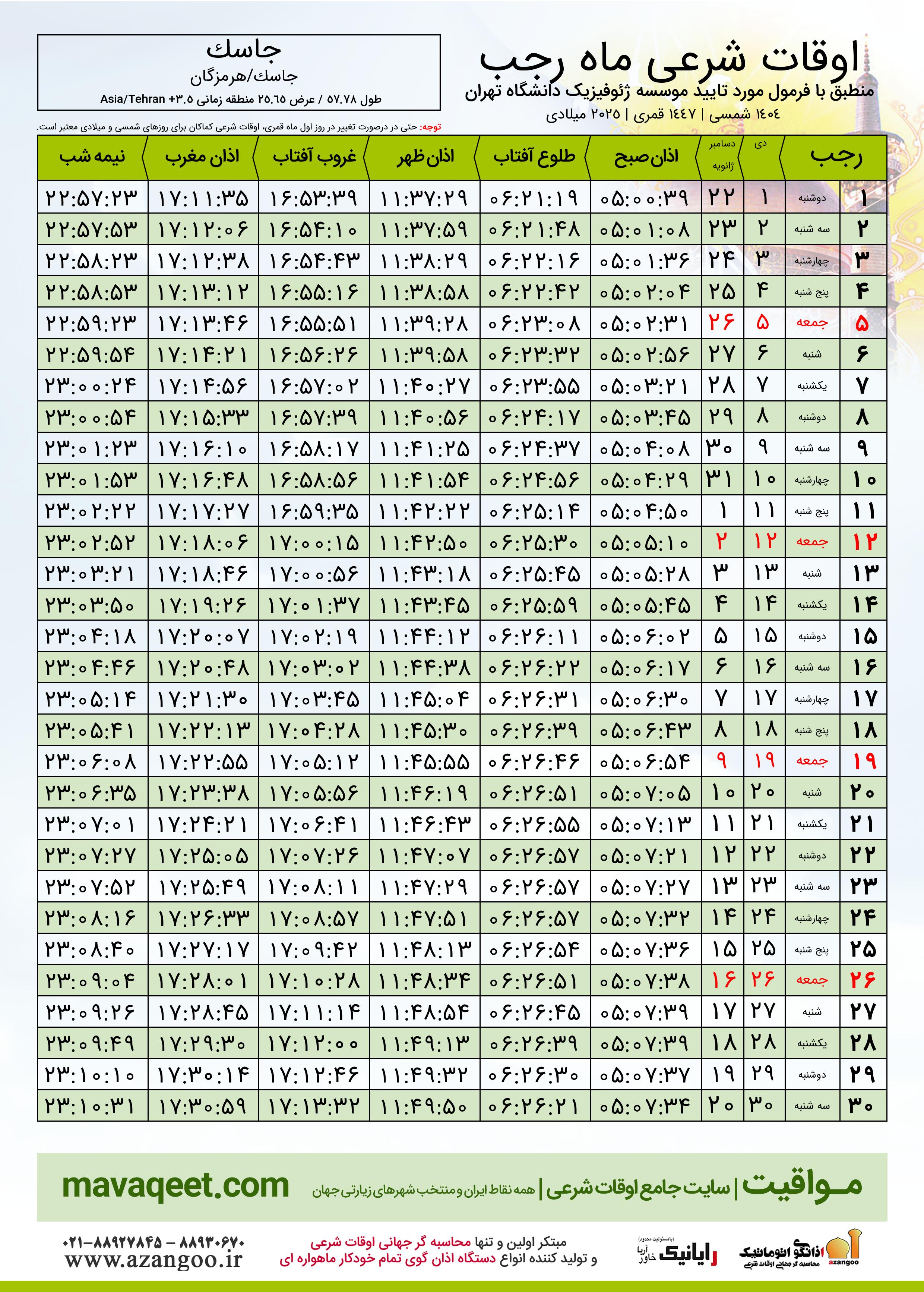 اوقات شرعی ماه رجب ١٤٤٧ هـ.ق شهر جاسک بر